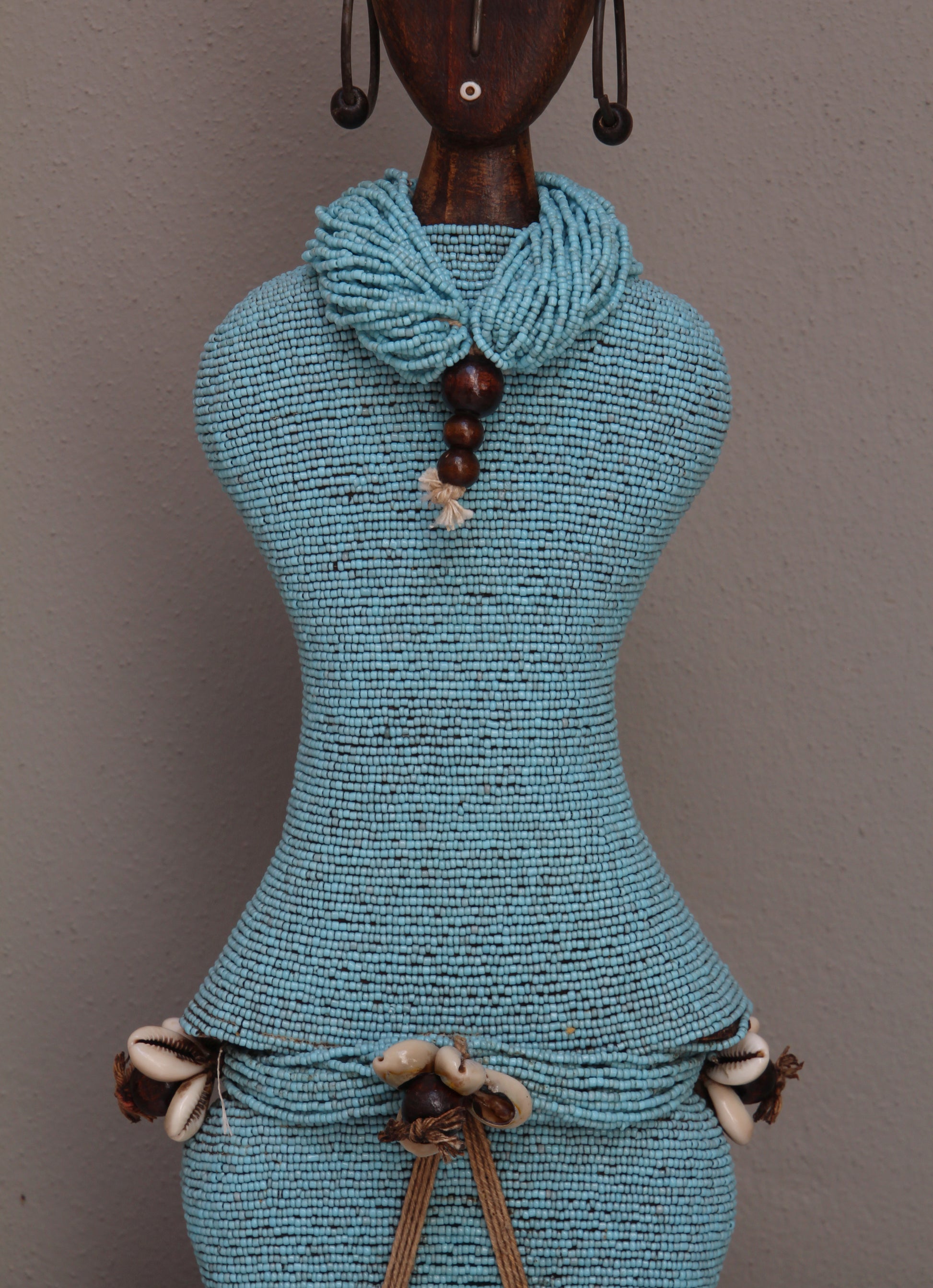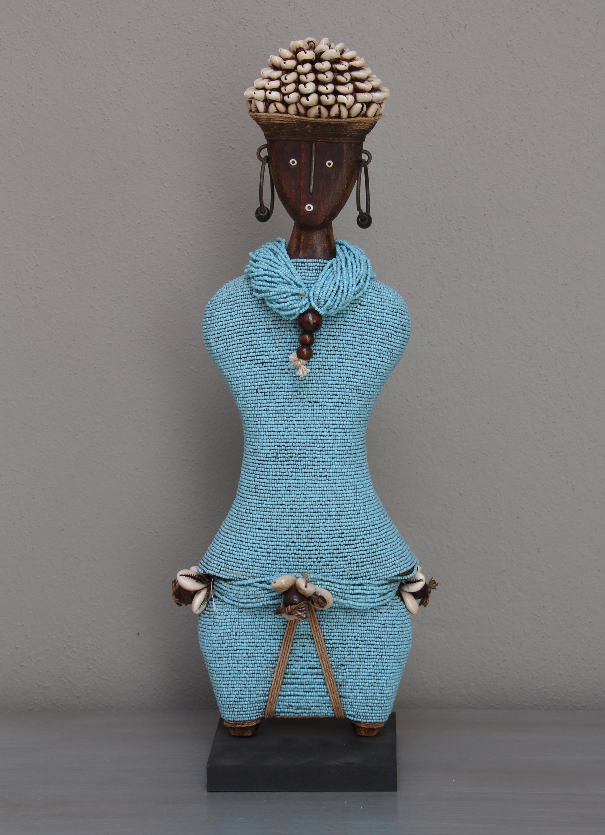 Striking and charismatic, the male Namji fertility doll is for those who favour the unusual. This beautifully crafted wooden doll is set on a wooden base and clothed in turquoise beads embellished with cowry shells. The traditional head covering also comprises tightly woven shells and together makes a striking visual image and a sure talking point regardless of your gender. Additional colours, sizes and styles available.