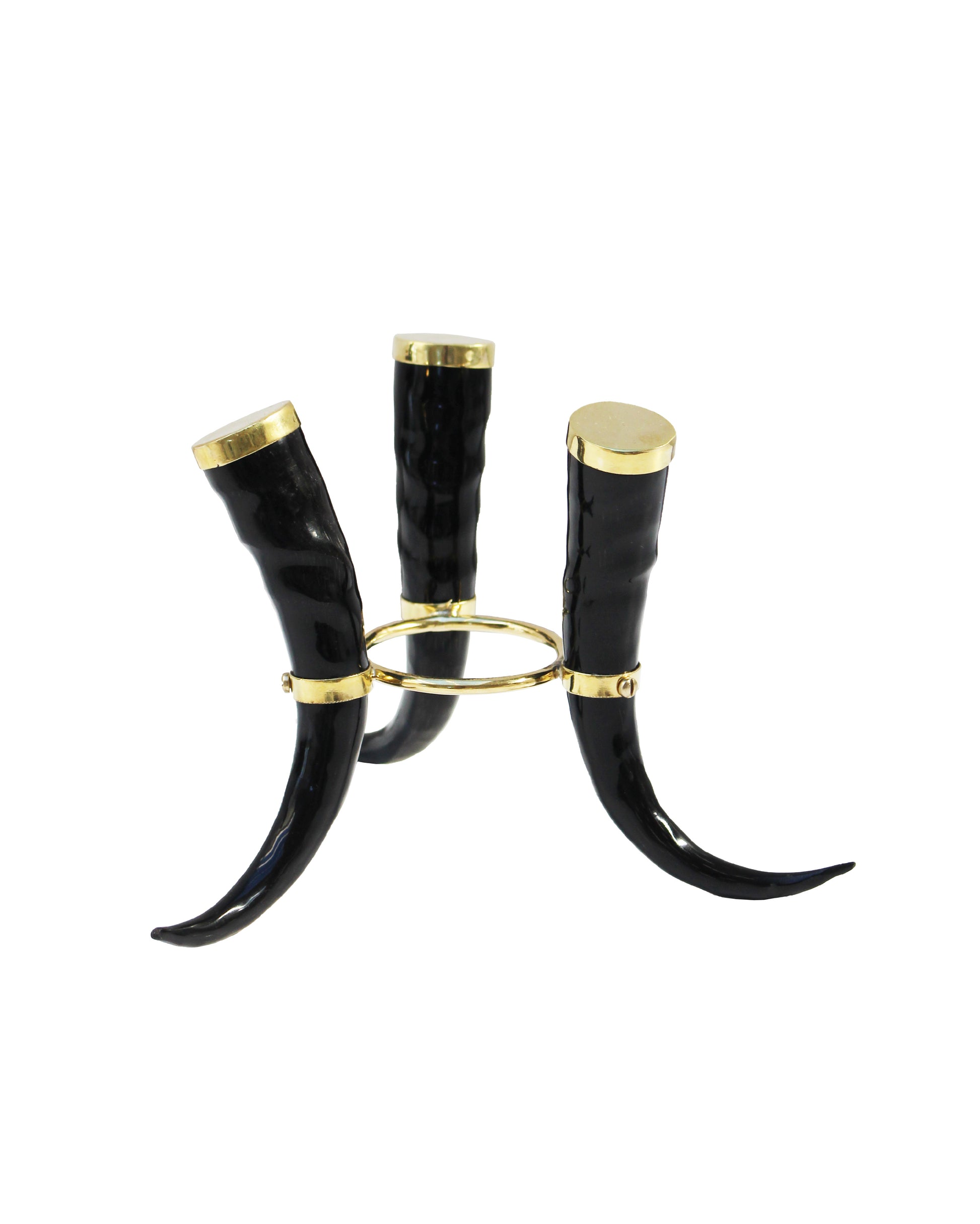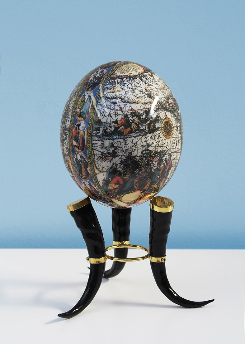 This simple, yet rich elegant stand of three glossy springbok horns banded together with bronze-type fittings forms a tripod that is a piece of art in its own right. This stand does not come with the decoupage egg, but can be purchased separately from our decoupage egg section. The dimensions are 17cm in diameter by 13cm high.