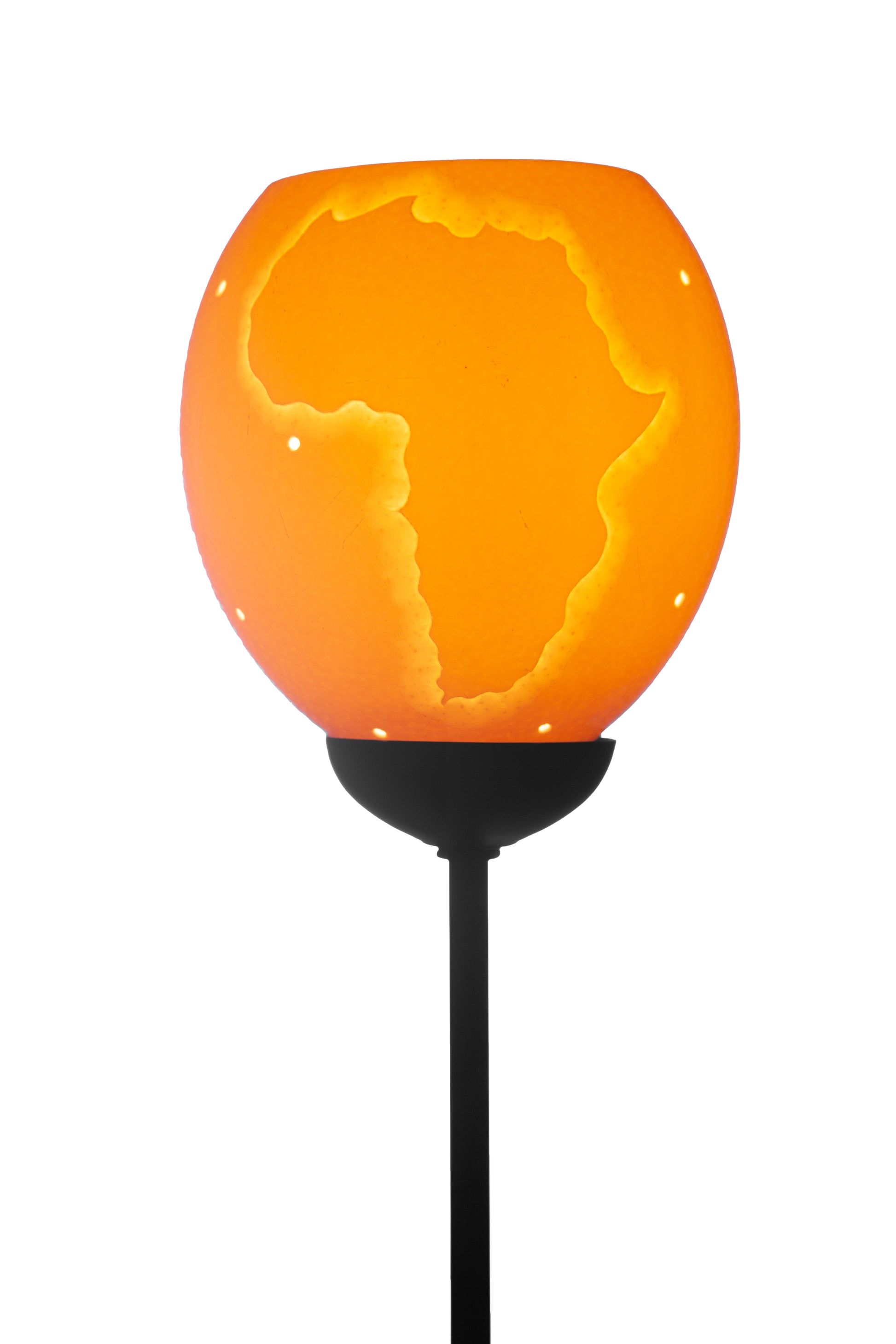 The typical rock art of Africa’s first inhabitants, the San, is shown through clever cut outs on the front of this ostrich eggshell, while the back is a carefully carved out African continent. The eggshell can be set on a metal lamp stand or used to hold a standard-sized tealight candle. The design is fun and unusual and the lamp makes for a perfect outdoor feature on a patio or in the garden. This tealight can also be made into a pendant upon request.