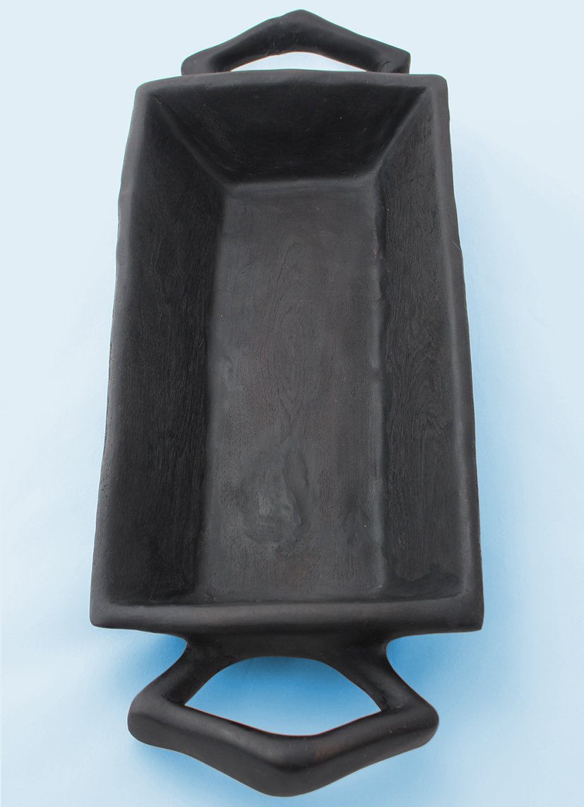 The long rectangular shape of this hand-carved African Jacaranda bowl is offset with diamond shape handles on the long side of the bowl. The dark richness of the wood complemented by vivid fruits or brightly glazed ostrich egg shells creates a dramatic centrepiece on any dining room or board room table. Simple, elegant and functional, this piece makes the perfect gift for… well, just about anybody.