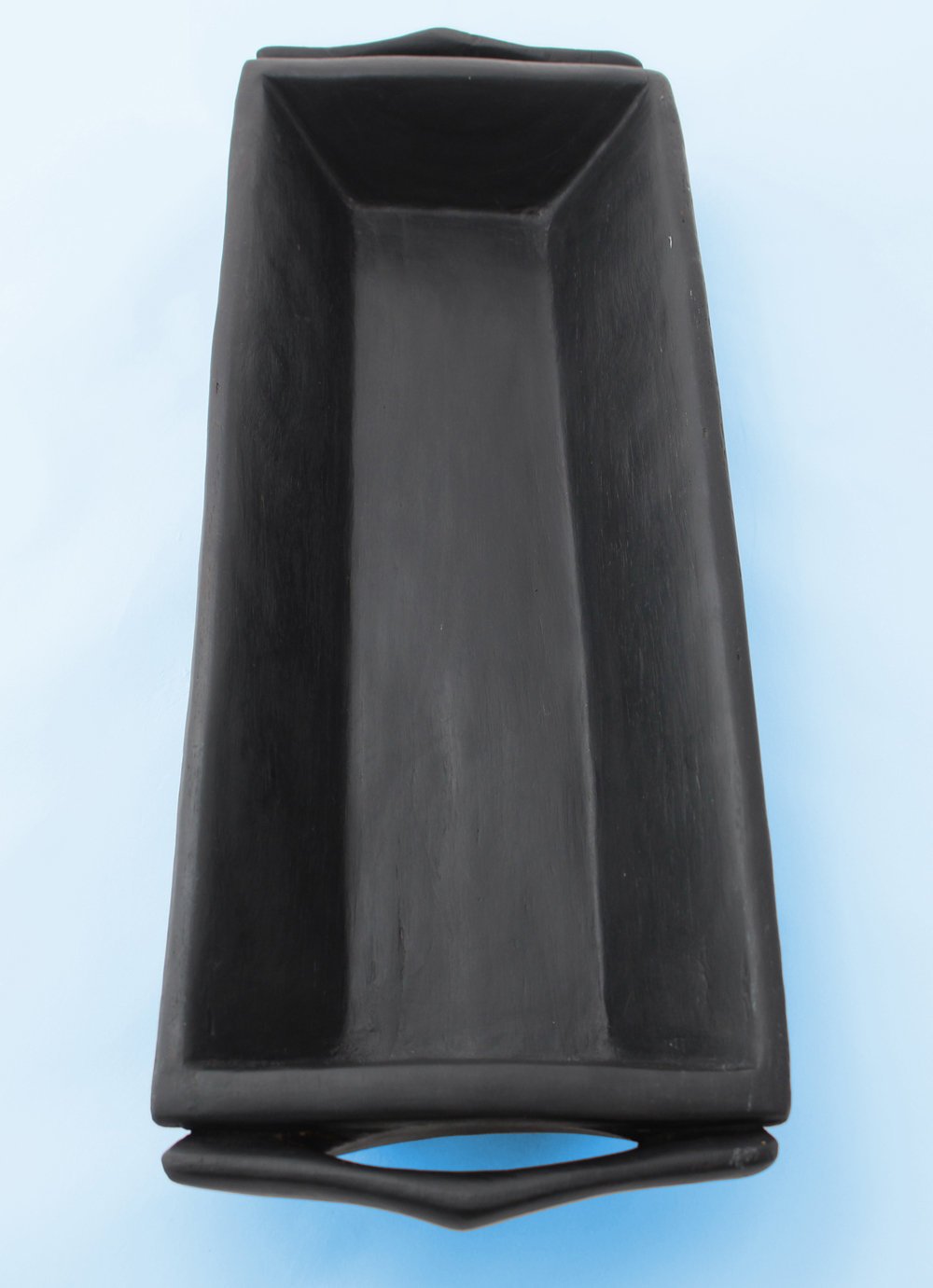 The long rectangular shape of this hand-carved African Jacaranda bowl is offset with triangular handles on the long side of the bowl. The dark richness of the wood complemented by vivid fruits or brightly glazed ostrich egg shells creates a dramatic centrepiece on any dining room or board room table. Simple, elegant and functional, this piece makes the perfect gift for… well, just about anybody.