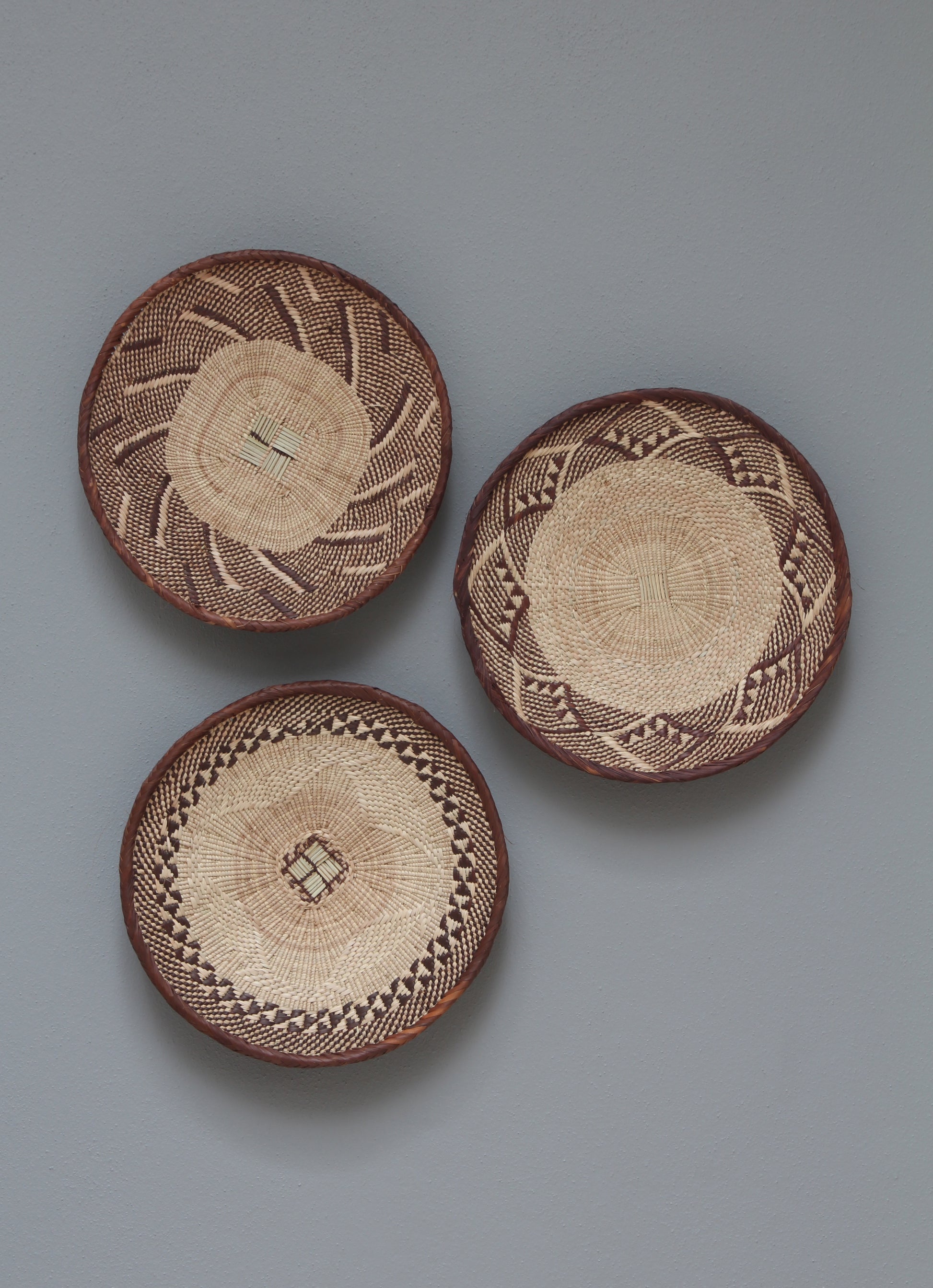 Three Tonga baskets are included sizes: 34cm, 33cm and 34cm in diameter. Tightly woven vine and palm leaf baskets are a firm favourite among Africans, used to store a multitude of things, including grains. You will find it useful in the bedroom, bathroom or dining room for holding jewellery, stones, beads or car keys… Or even group them as an eye-catching collage on the wall. Contrasting yellow-cream vines are superbly woven together to create a geometric pattern with a detailed base.