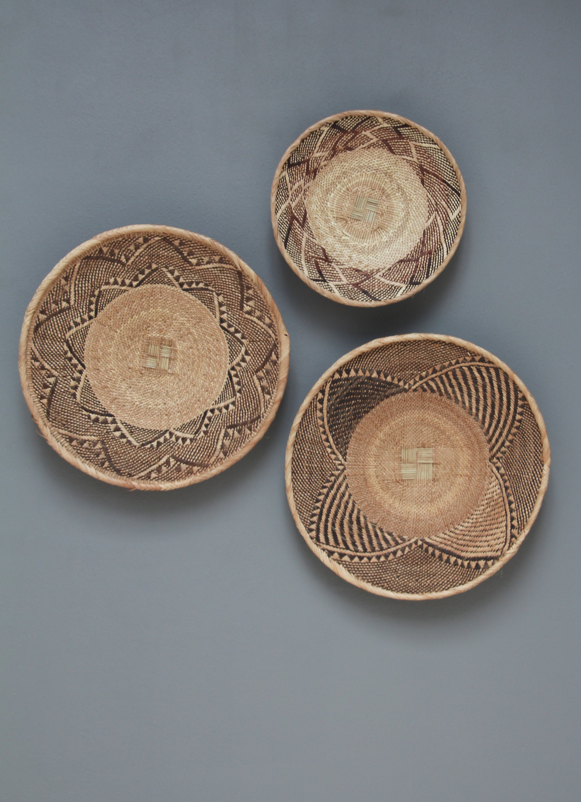 Three Tonga baskets are included sizes: 34cm, 45cm and 45cm in diameter. Tightly woven vine and palm leaf baskets are a firm favourite among Africans, used to store a multitude of things, including grains. You will find it useful in the bedroom, bathroom or dining room for holding jewellery, stones, beads or car keys… Or even group them as an eye-catching collage on the wall. Contrasting yellow-cream vines are superbly woven together to create a geometric pattern with a detailed base.