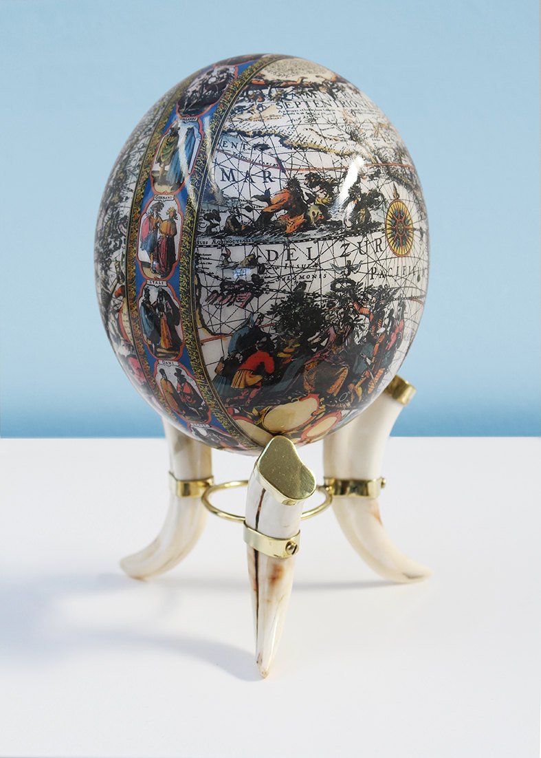 Three warthog tusks are joined with a simple brass circle linked to bands around each tusk, which is finished with a closed brass ending. Eloquent and haunting, this 'ivory' tripod is an elegant accessory to any home. This stand does not come with the decoupage egg, but can be purchased separately from our decoupage egg section.