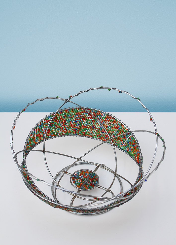 This truly African art/craft piece blurs the lines between typical beaded bowl and something more modern. Circular wire frames intersect at various junctures with two main cross-sections beaded beautifully in a mosaic of red, blue, green and orange. A striking piece.