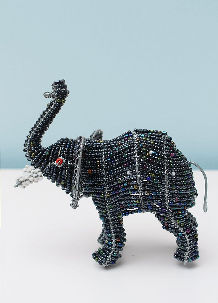 This beaded, wire-framed African elephant stands with its trunk raised, tusks forward and shimmers with metallic blue, green, pink and blue beads scattered throughout the shiny grey used over most of the trunk. Approximately 14cm in length and 14cm high but can be custom-made to any size.