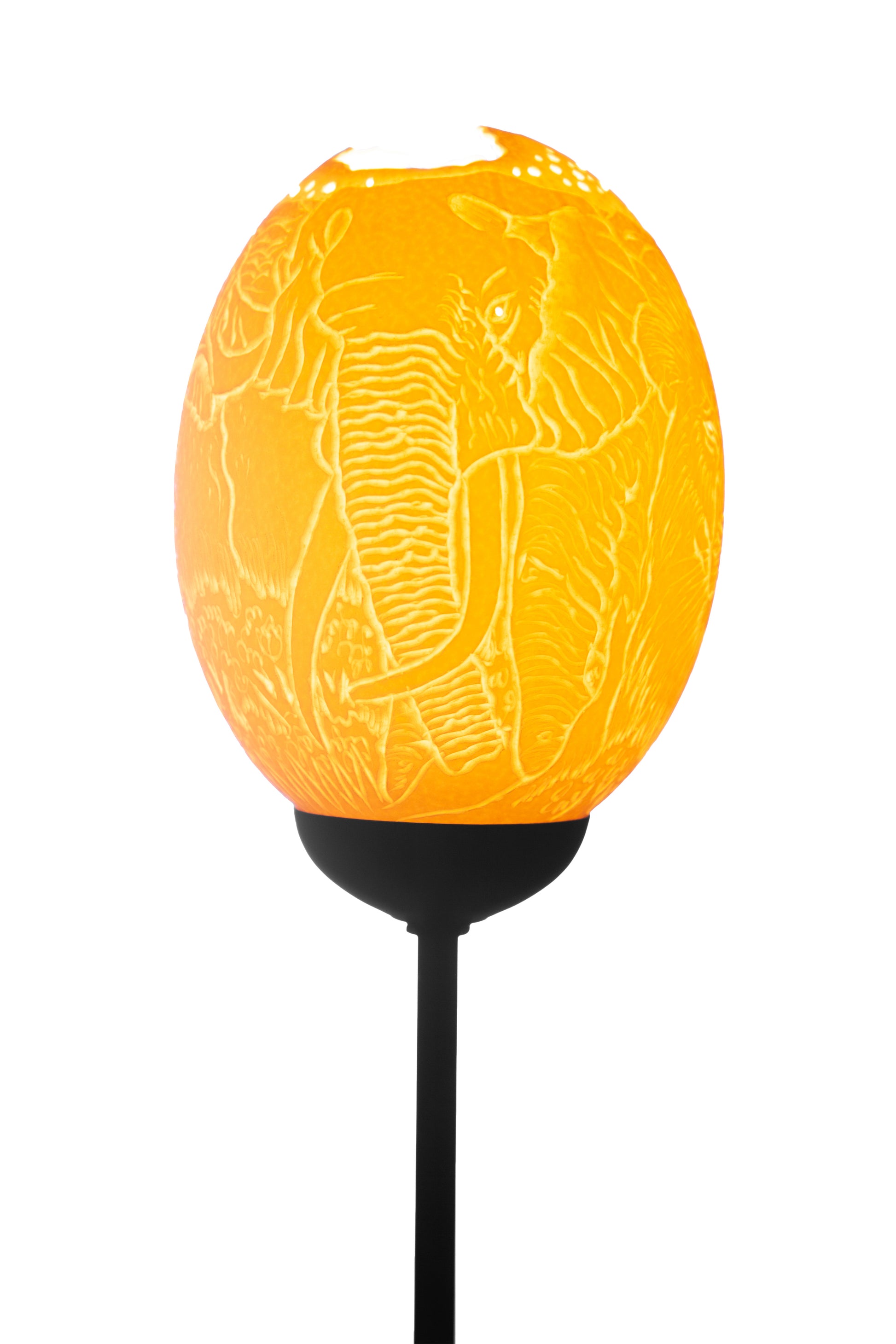 Depicting Africa’s most famous wildlife – the Big 5 comprising the lion, elephant, rhino, buffalo and leopard – all with the shape of Africa cut out above them, this vibrant ostrich eggshell lamp evokes a subtle sense of the African wilderness. The elegant metal stand balances the beautifully carved ostrich egg, which gives off a welcoming glow when lit. This egg can also come as a tealight/candle holder. Certificates of authenticity supplied on request.