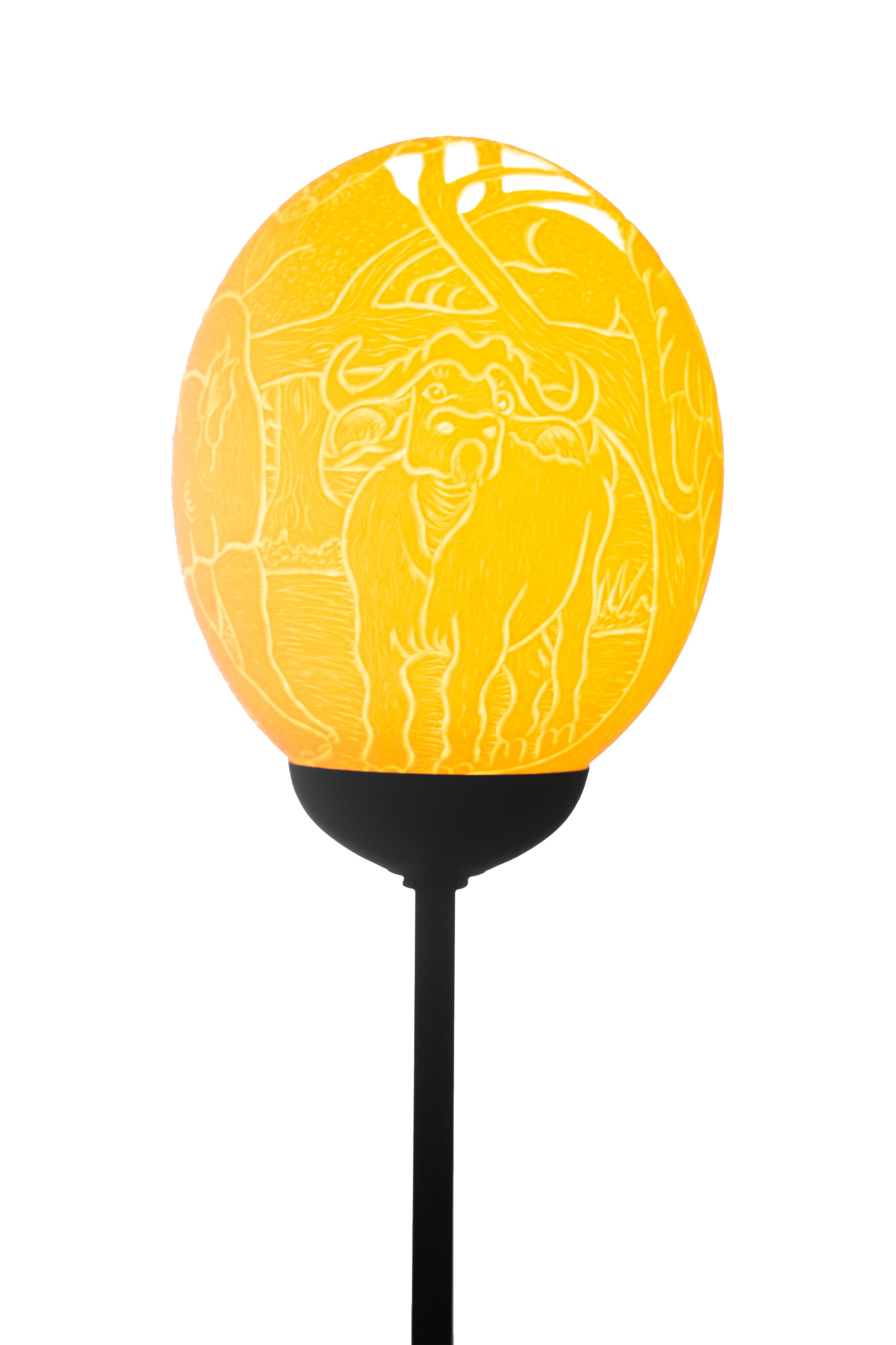 Bringing a touch of Africa into the home, a proud lion stares out from the front of this exquisitely carved ostrich eggshell lamp while on the back a standing buffalo is depicted among trees and bush. An elephant, rhino and leopard adorn the sides. The cut out space on top of the lamp allows the warm light to escape. An elegant freestanding metal stand supports the eggshell. Certificates of authenticity supplied on request.