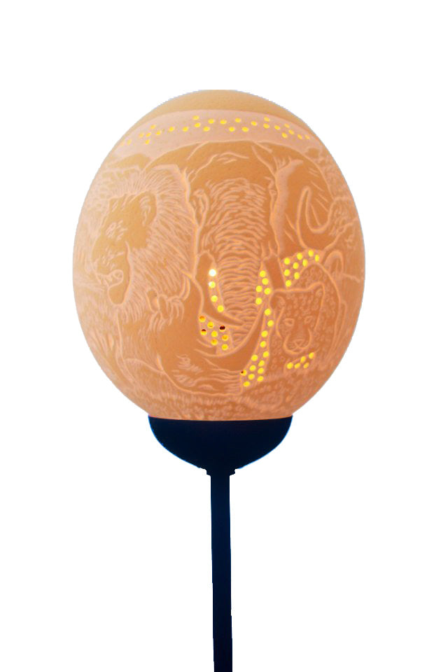 Mark is a designer from Dysselsdorp in the Western Cape. For 16 years Mark has been creating inspiring designs and carving them into ostrich egg shells. Taught by George Malgas, Mark has mastered the skill of using dentistry tools to delicately drill the beautiful imagery into the shells. He finds joy in seeing the end result of his work and the satisfaction from happy customers. Â