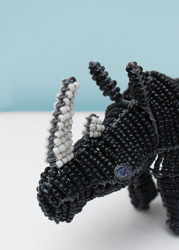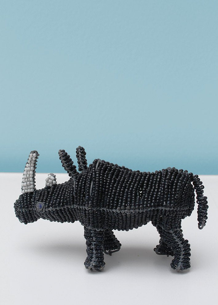 The rhinoceros is one of the most feared animals in Africa. Its spirit and determination, without the danger, is perfectly captured in this black beaded version on a sturdy wire frame, with a domineering white beaded horn. Approximately 17cm in length and 9.5cm high but can be custom-made to any size.