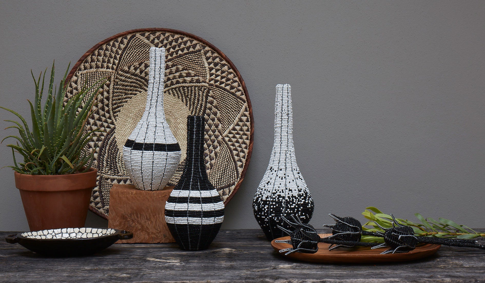 Shaped like iconic African gourds at the bottom with a rising elegant neck, these striking black and white beaded decorative vases are pure class. Their appealing shape and well-structured form ensure them a place in upmarket offices and homes. Dimensions 35cm tall by 14cm wide.