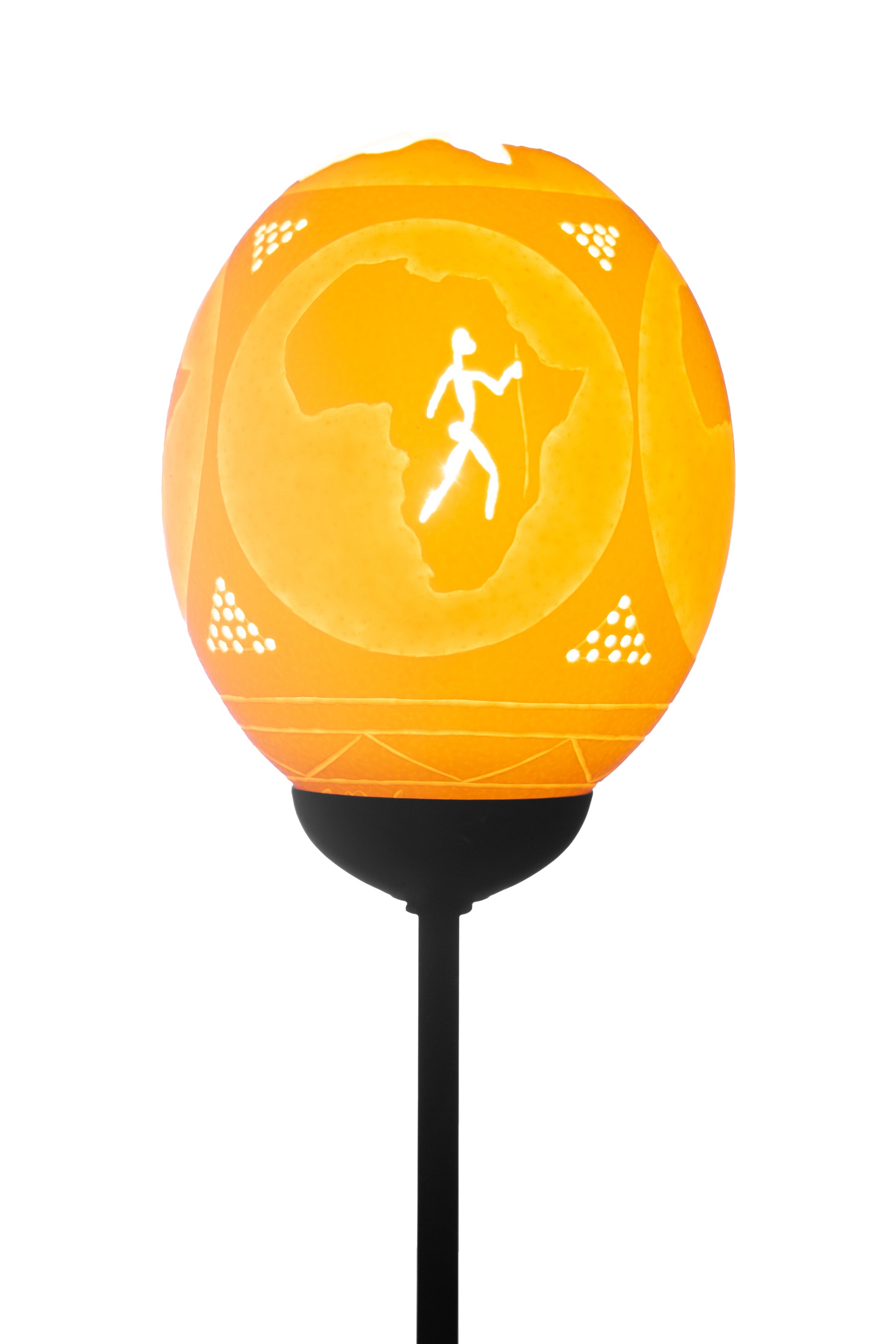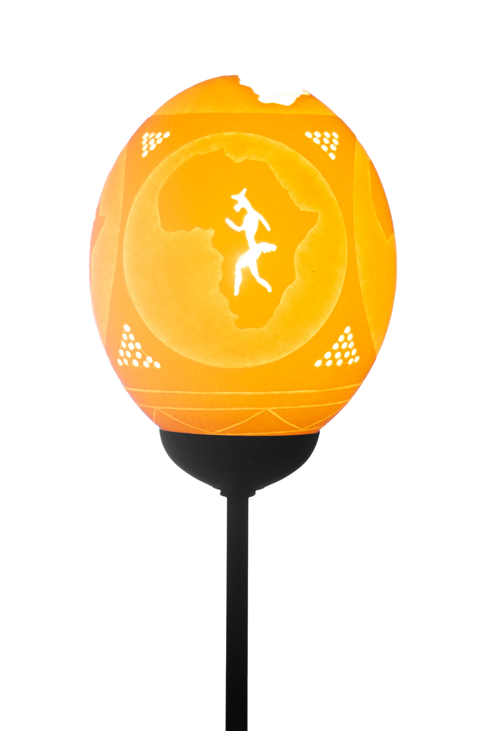 The rich detail on this ostrich eggshell lamp is heartwarming as is the glow from the yellow egg. A geometric design of interlinking squares and triangles, with circles within, divides the egg with a circle depicting the planet etched on each side with the African continent within that and then a further dimension is added with a cut-out of a bushman figure. Certificates of authenticity supplied on request.