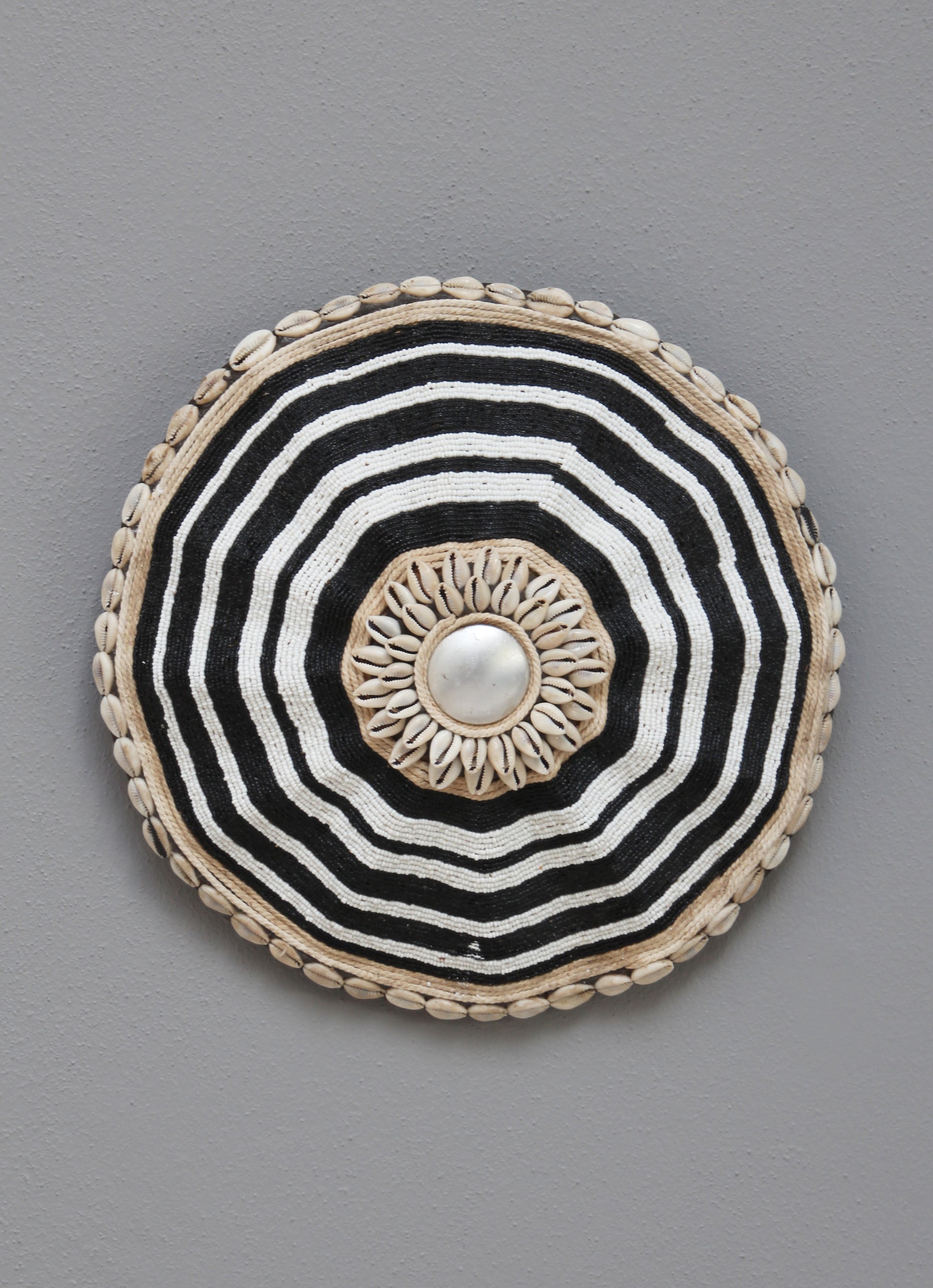 The Tikar shield has been traditionally used as a defensive weapon, displayed as a decorative or ritual symbol of status and wealth by the Tikar tribe in Cameroon. Hand-carved from one solid piece of wood, African shields are synonymous with the sense of the open veld, wildlife and the ancient history of Africa. This cowry shell shield is distinctly patterned with shells and metal on wood. A perfect wall decoration - on its own or paired with others. The shield is 34cm in diameter.