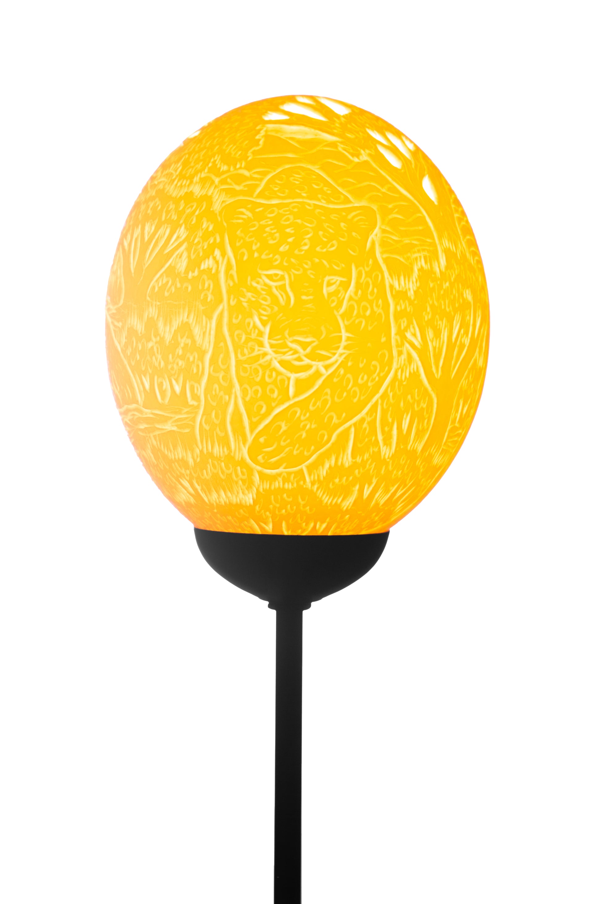 Set atop an elegant metal lamp stand, this beautifully hand-carved ostrich eggshell displays the majesty of Africa’s big cats. On the front, a male and female relax in the African savannah while on the back, one of these majestic creatures strolls straight towards you! Providing a warm glow, this unique lamp makes for the perfect addition to any home and the perfect gift. Certificates of authenticity supplied on request.