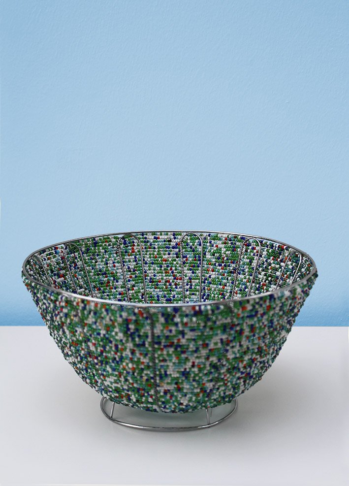 With a simple wire frame base and framework, this colourful bowl reflects the green, blue, red and white beads that have gone into crafting the body. A great gift and perfect for use in the lounge or kitchen.