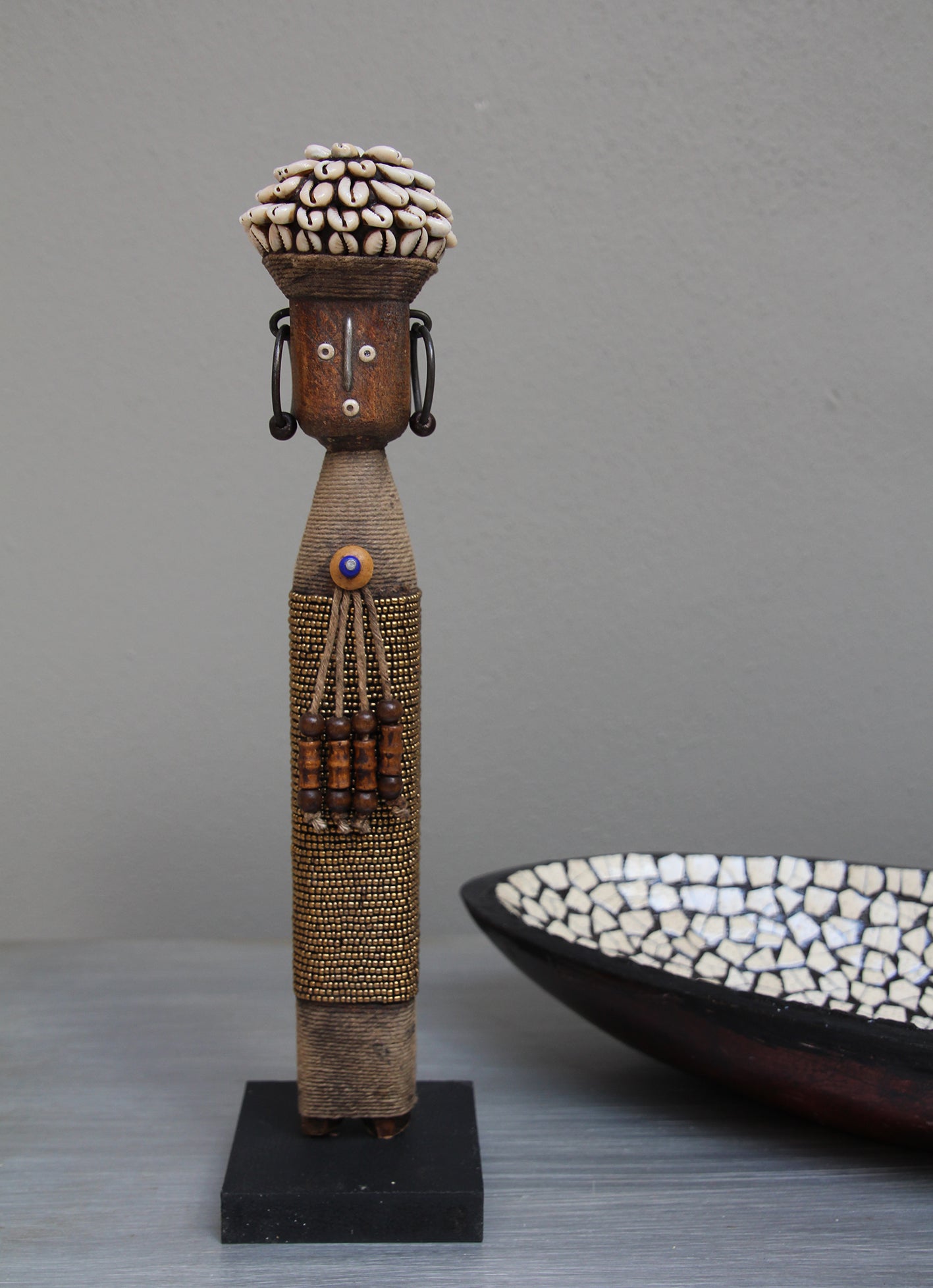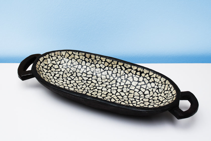 This vibrant African wooden bowl is finished with a mosaic interior of polished, cut and carefully placed pieces of ostrich eggshell. The cream interior contrasts with the carved African wood to create a classic and unusual counterpoint to the fruit, nuts or mementoes it is destined to hold. The sturdy wooden handles on either end ensure that the bowl is easy to carry. A fantastic gift, although you might end up buying one or two for yourself as well.