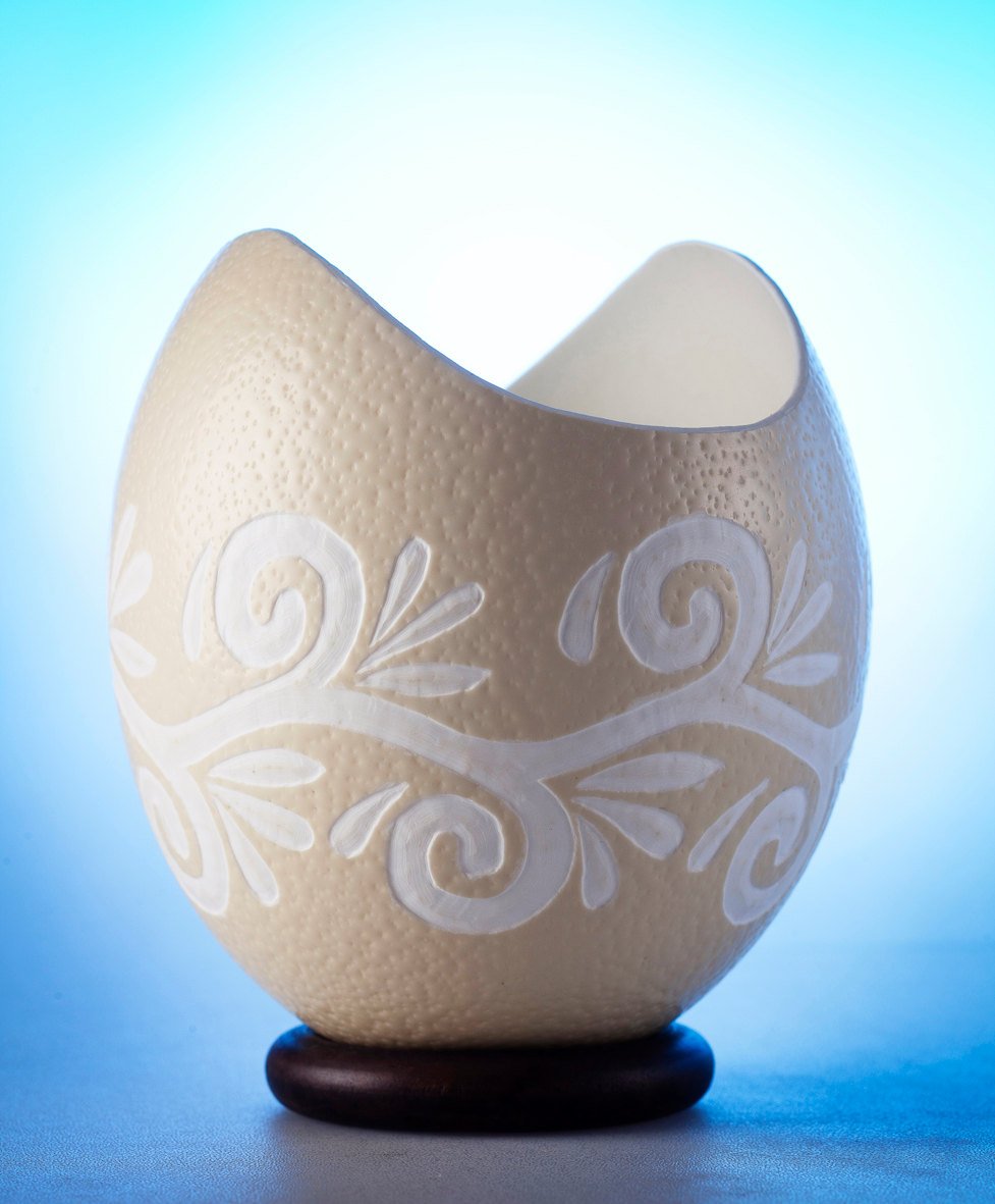 The stark simplicity of the ostrich eggshell is beautifully complemented by an engraved pattern circling below the curved edge. This is a beautiful piece of artistic craft, which will add a stylish touch of Africa to any dining room, kitchen or even bedroom. The base of the shell rests on a circular wooden stand providing a natural contrast to the texture of the egg.