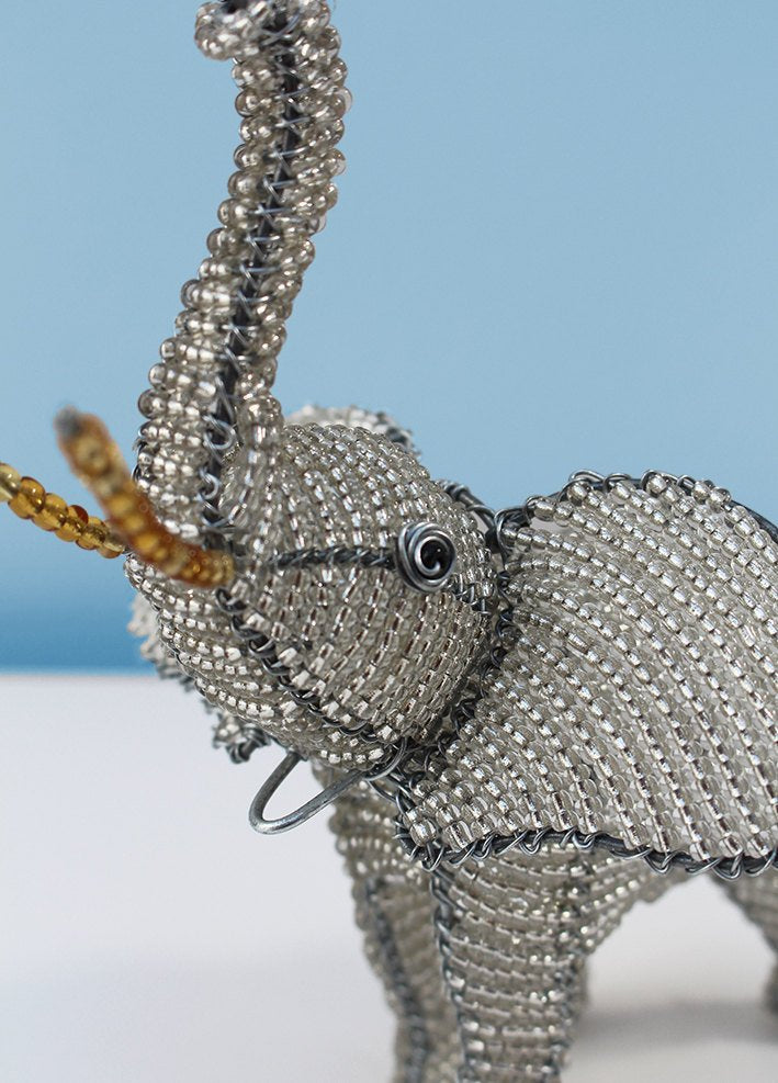 A great addition to the bookshelf or desktop, and a fantastic gift to children, this beautifully portrayed African elephant stares off into the distance with trunk raised and golden beaded tusks pointing the way forward. A wire frame is artfully covered in shiny grey beading. Approximately 17cm in length and 17cm high but can be custom-made to any size.