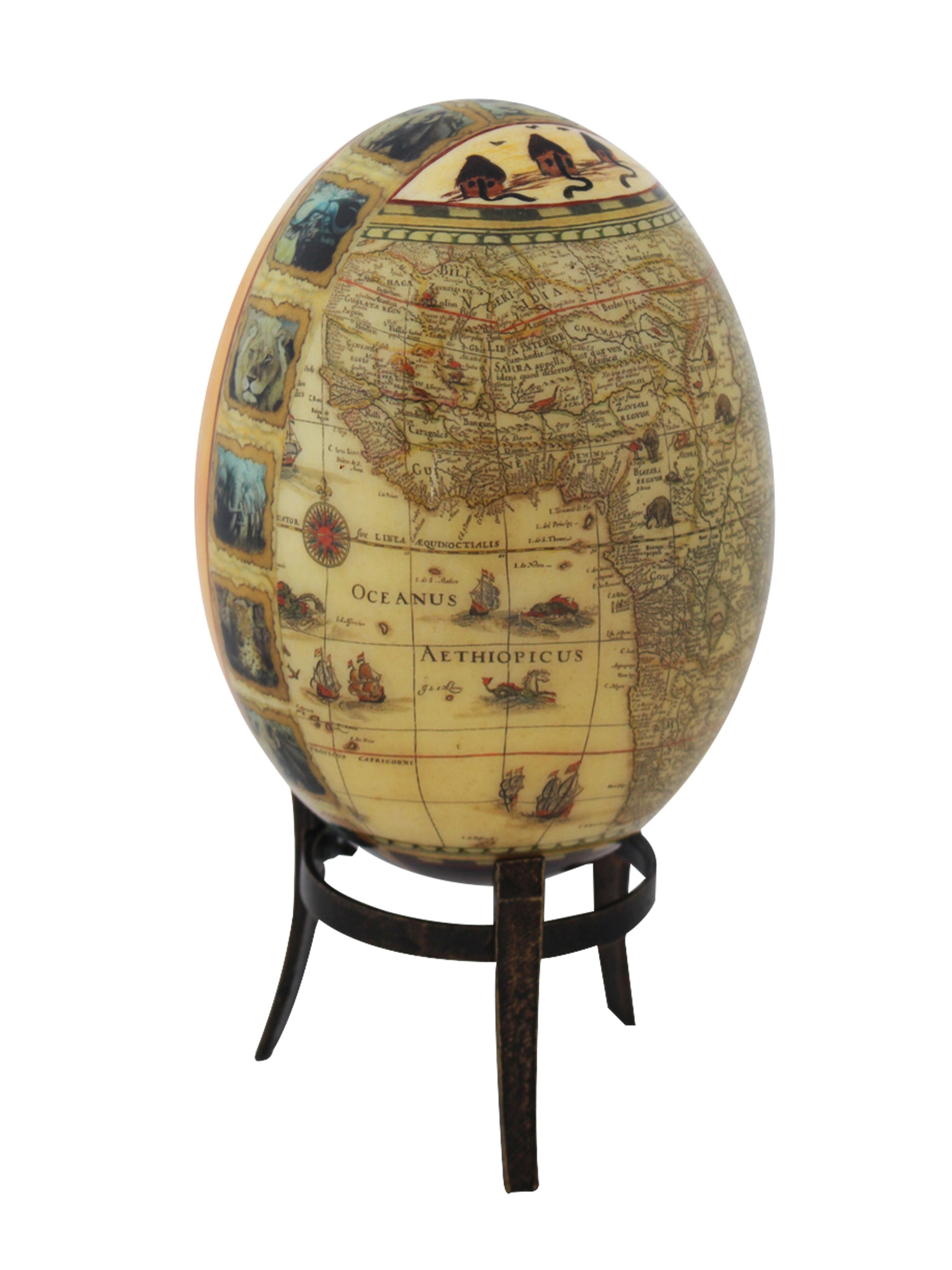 The subtle and somewhat nostalgic background hues to the beautifully depicted Venda girl in traditional skins and jewellery on the one side of this stunning piece of art is contrasted with the rich detailing of the map of Africa on the other side of the ostrich eggshell. The general and the specific are joined by a strip of exquisite portraits of the continents famous wildlife. Set on an elegant brass stand, this unique piece of décor would not be out of place in an elegant bedroom or sumptuous parlour.