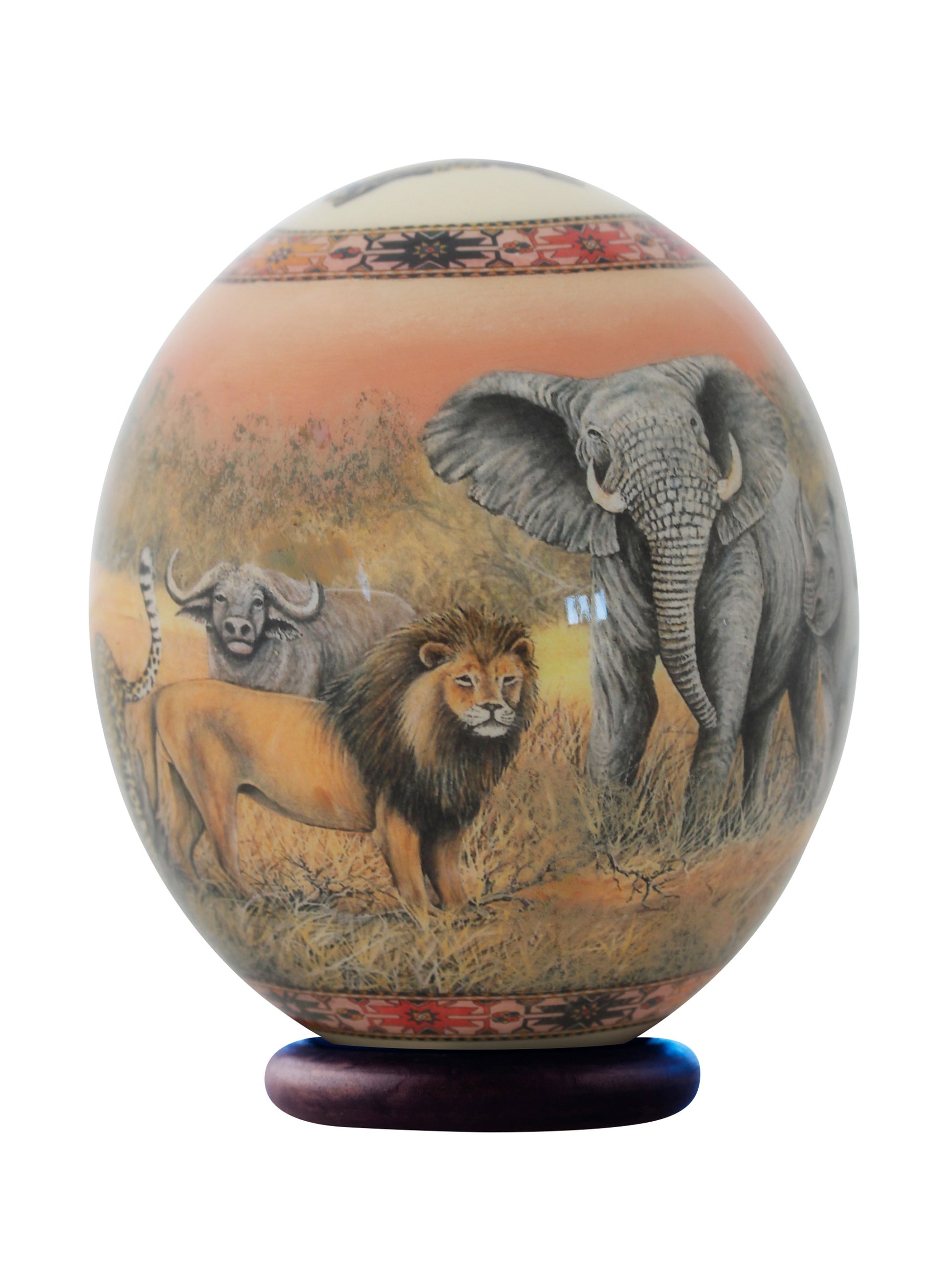 Vibrant and original, this ostrich eggshell piece has been transformed by skilful decoupage depicting Africa's magnificent Big 5 in a natural bush setting. With almost lifelike depictions of these fearsome creatures on the front and an exceptionally detailed old-styled map of Africa on the back of the egg, smaller frames capture further portraits of each up the sides of the egg, which rests on a natural wooden base or brass stand. An evocative piece of Africa, this ostrich eggshell would not be out of place in studies or dining rooms.