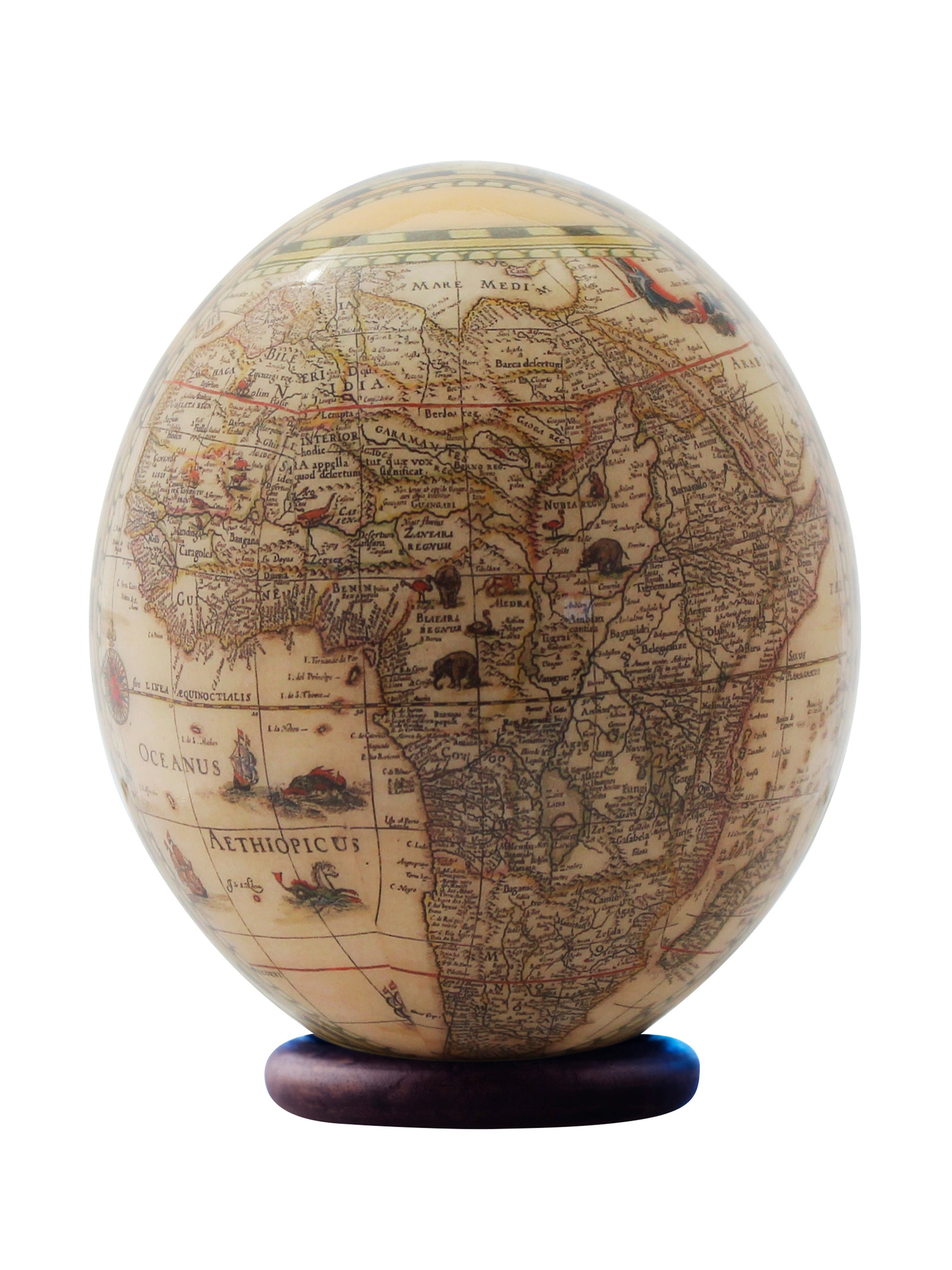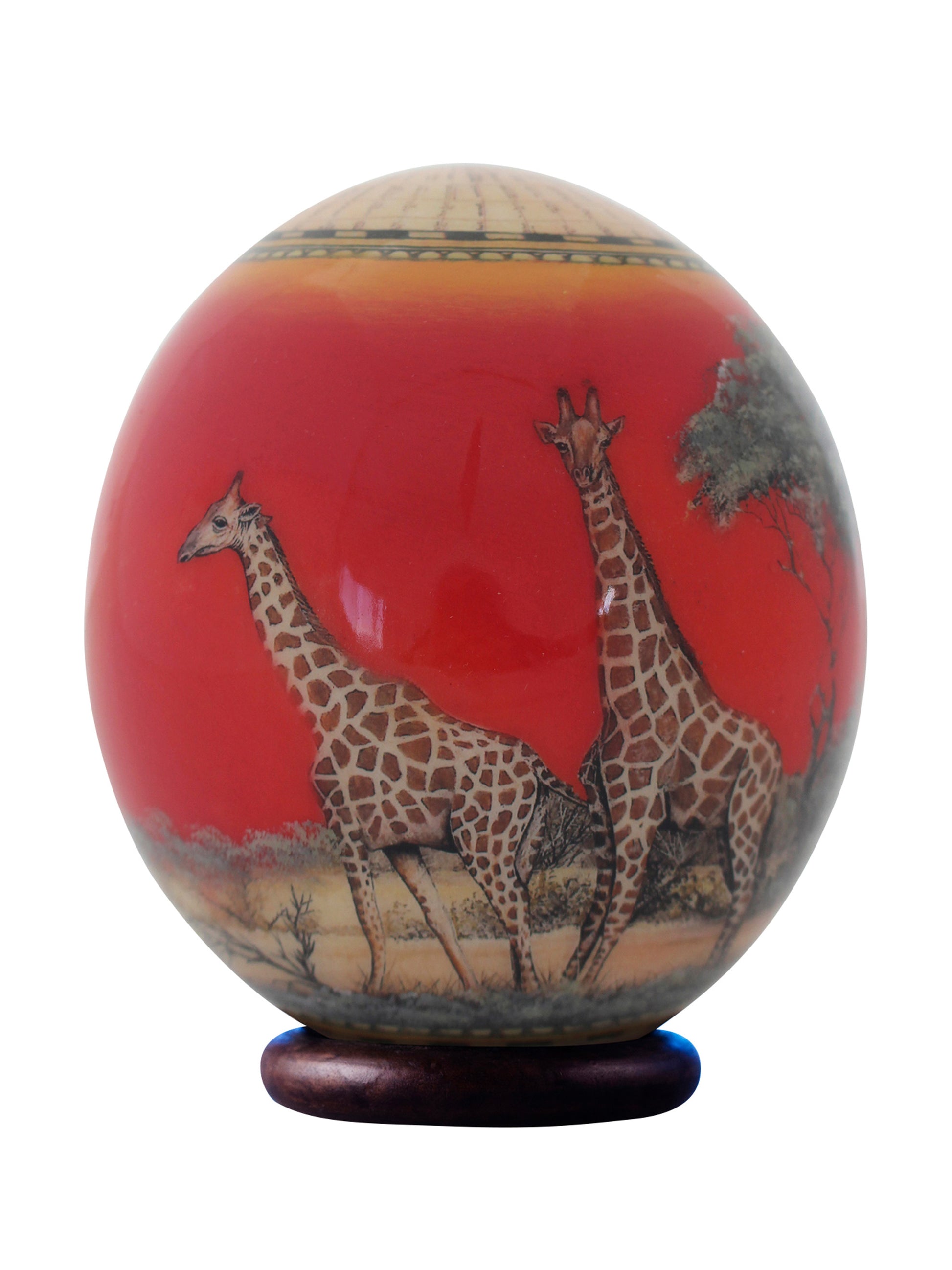 Two gangly giraffes appear in their natural bushland setting on the front of this exquisite African decor item. The ostrich eggshell is painted on the back with a simple relief map of Africa exuding the mystery and romance of the exotic continent. A vertical band of snapshot images of the Big 5 circle the egg adding to the sense of restrained wildness. A fantastic gift or souvenir for all those with fond memories of Africa or a desire to visit.