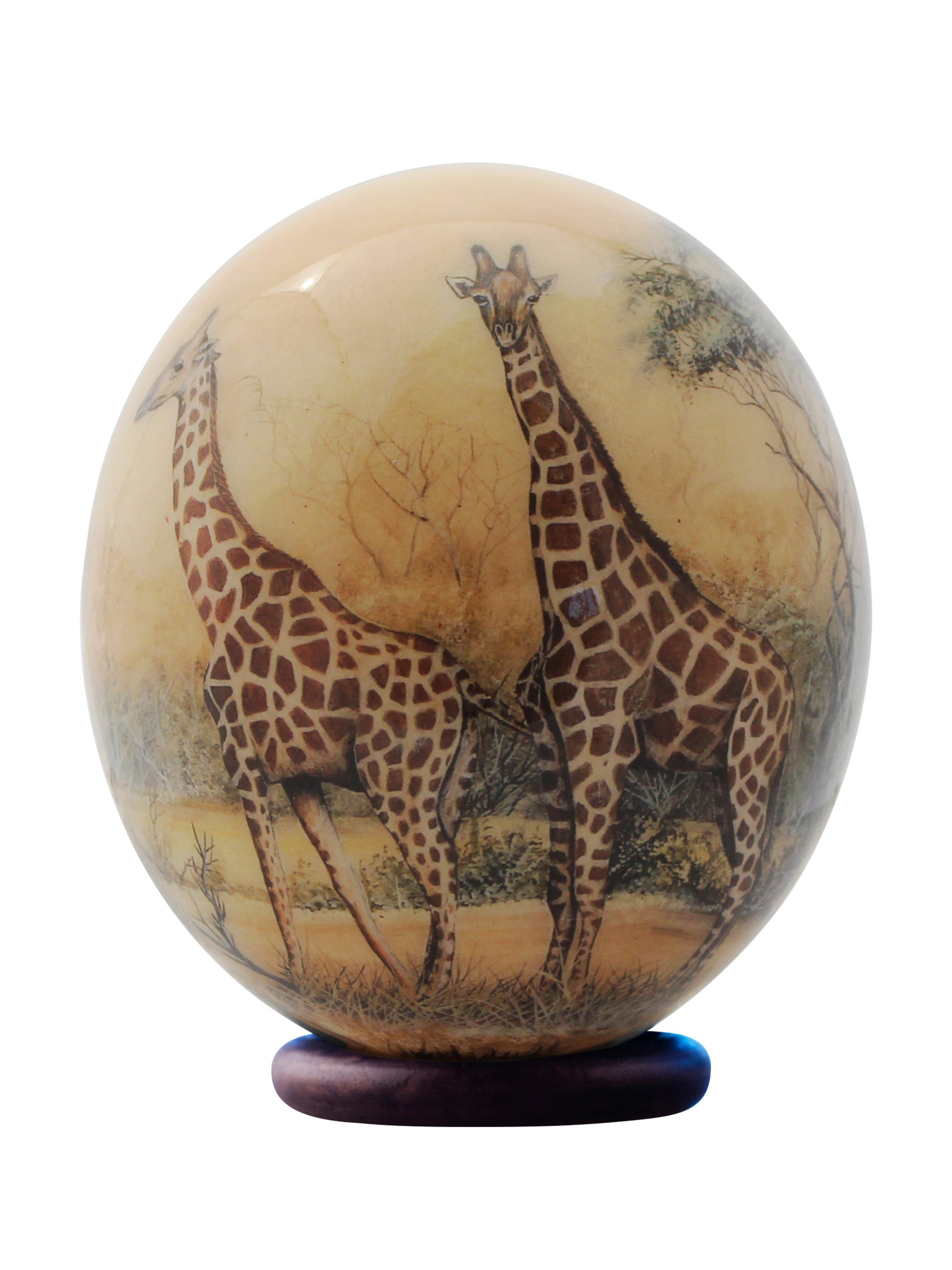 Two gangly giraffes appear in their natural bushland setting on the front of this exquisite African decor item. The ostrich eggshell is painted on the back with a simple relief map of Africa exuding the mystery and romance of the exotic continent. A vertical band of snapshot images of the Big 5 circle the egg adding to the sense of restrained wildness. A fantastic gift or souvenir for all those with fond memories of Africa or a desire to visit.