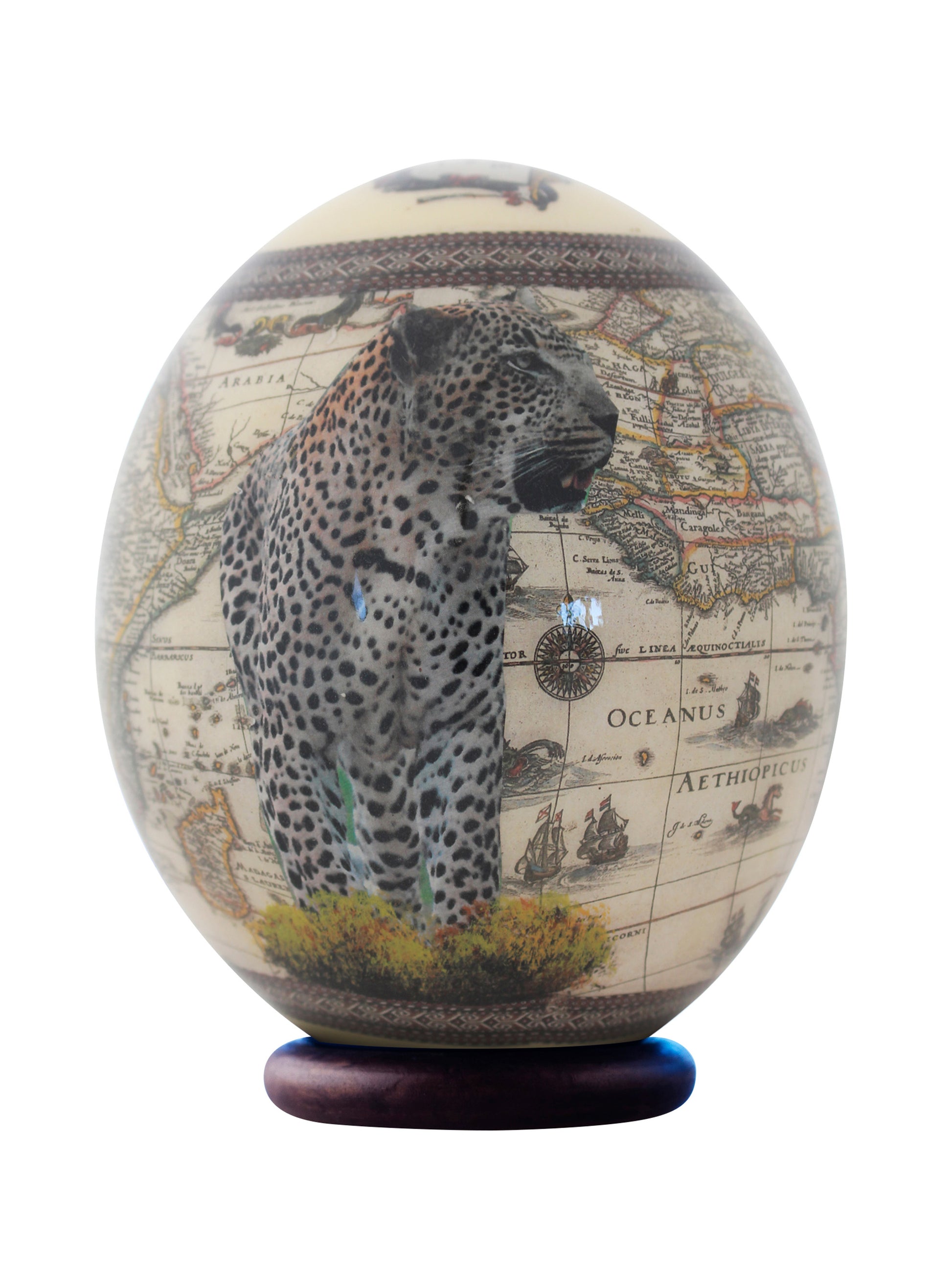 A single leopard stalks his prey on the front of this ostrich eggshell decor item. The rich detailed map background provides a beautiful contrast to the sleek lines of the leopard. On the back an African map provides the context for this unusual decor item.