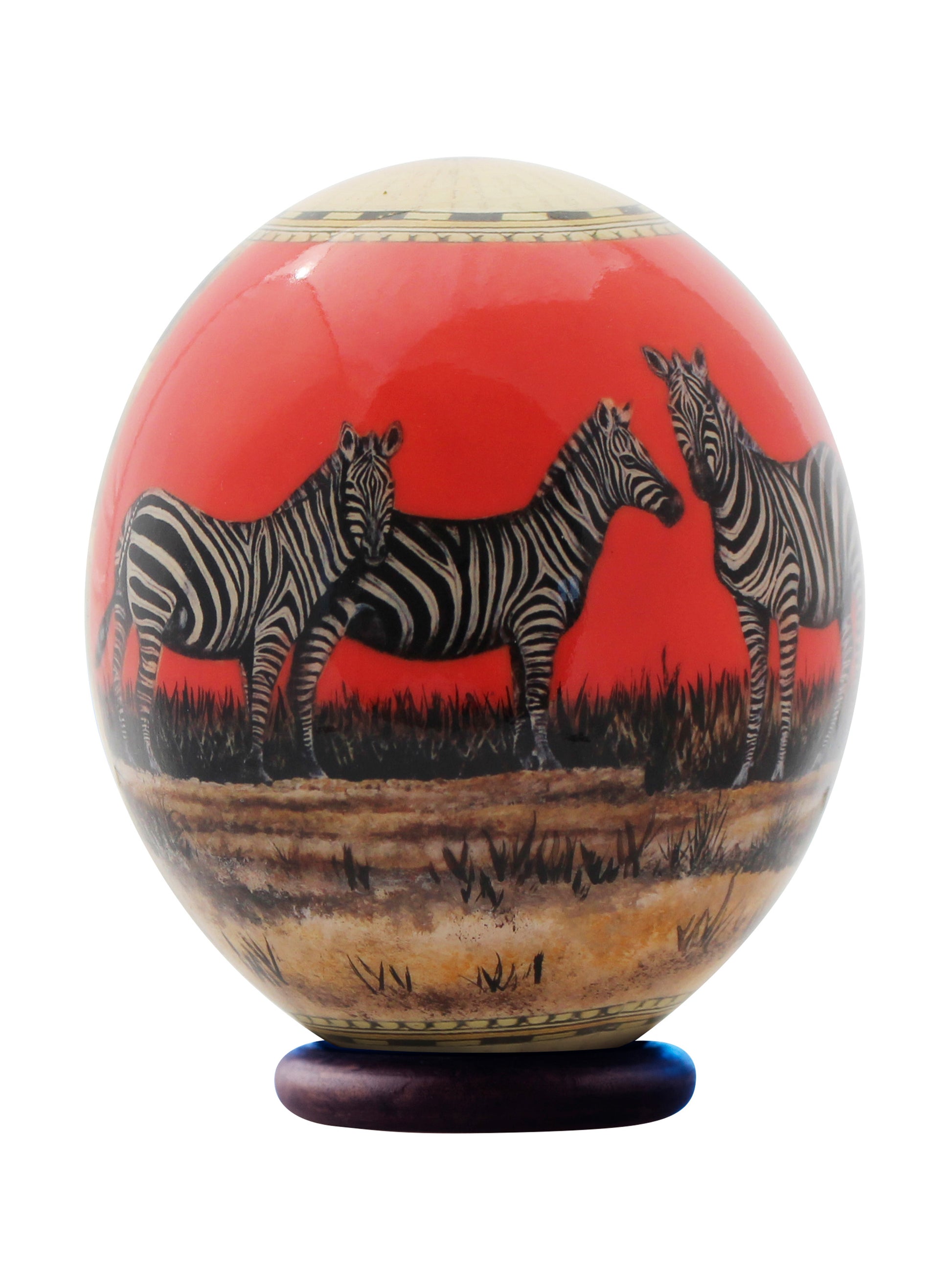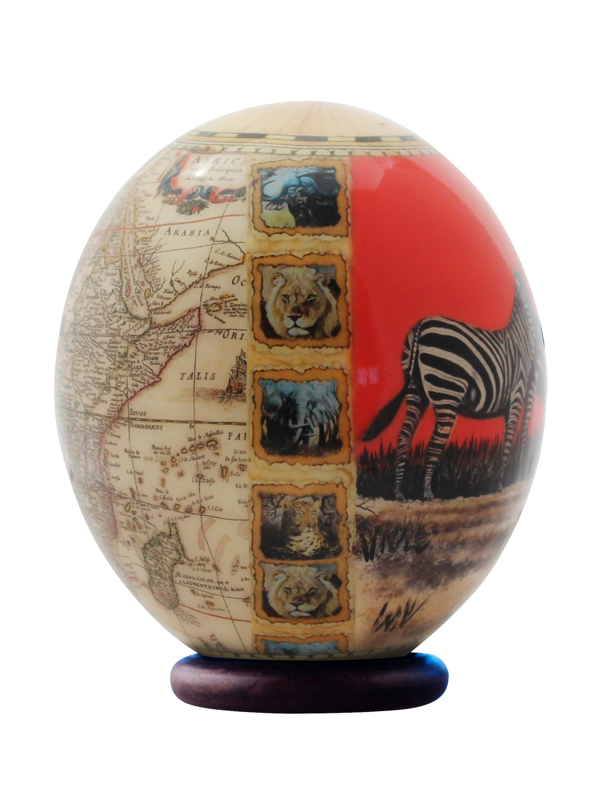 Three black and white zebra are portrayed against a rich red sky on the characteristic African bushveld. The Big 5 surround them in smaller snapshots in a vertical band that circles this unusual African decor item ā the beautiful ostrich eggshell. A detailed map of Africa is offered on the back of the egg contributing to the exotic gift or souvenir this item makes.