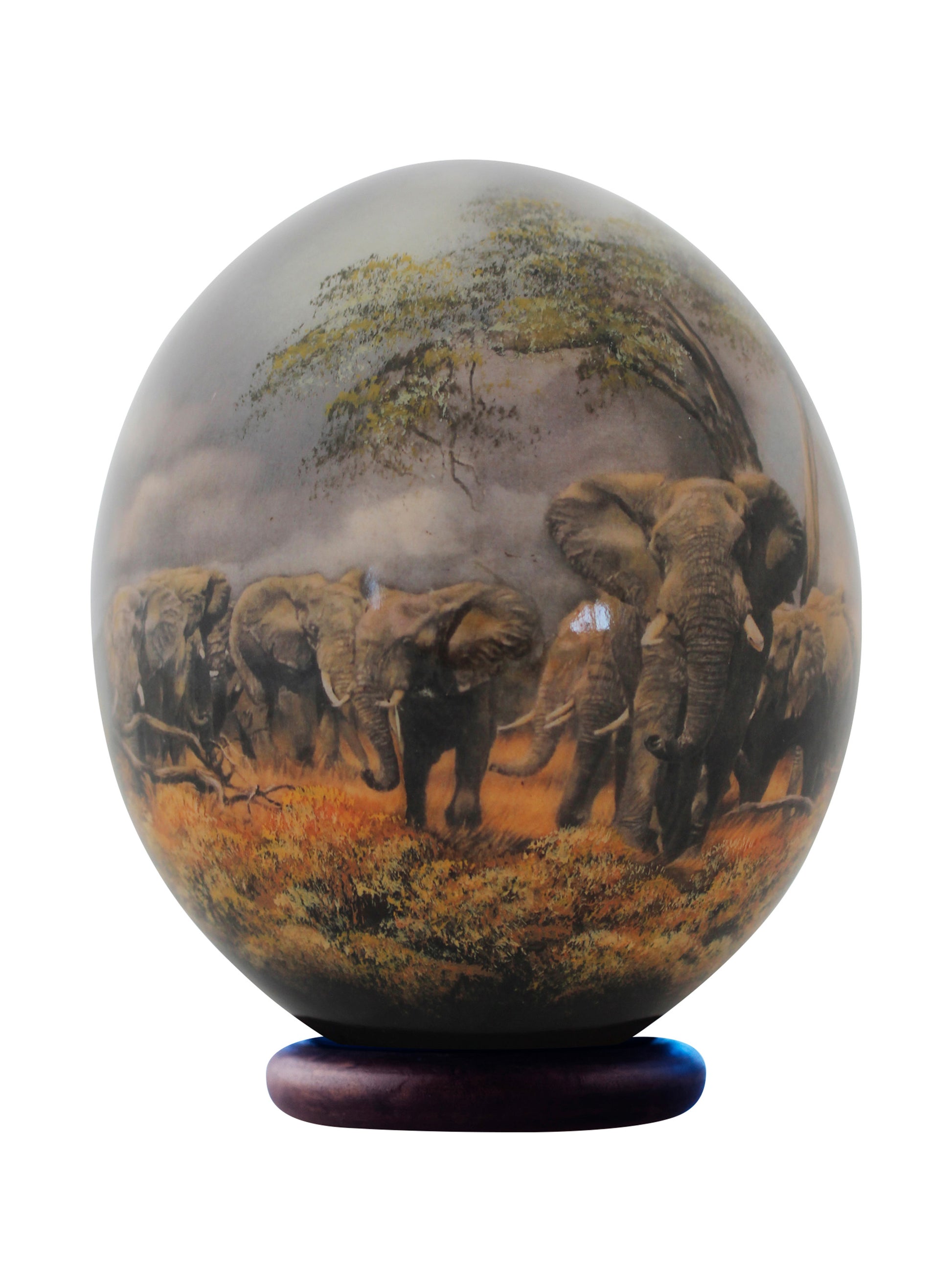 A majestic herd of African elephants, in their full glory, stare out of this beautifully painted decoupage ostrich eggshell. Set against the rich hues of the setting sun the elephant is evocatively depicted and sure to be a conversation piece in both the home and office. A perfect gift or memento for those dreaming of Africa.