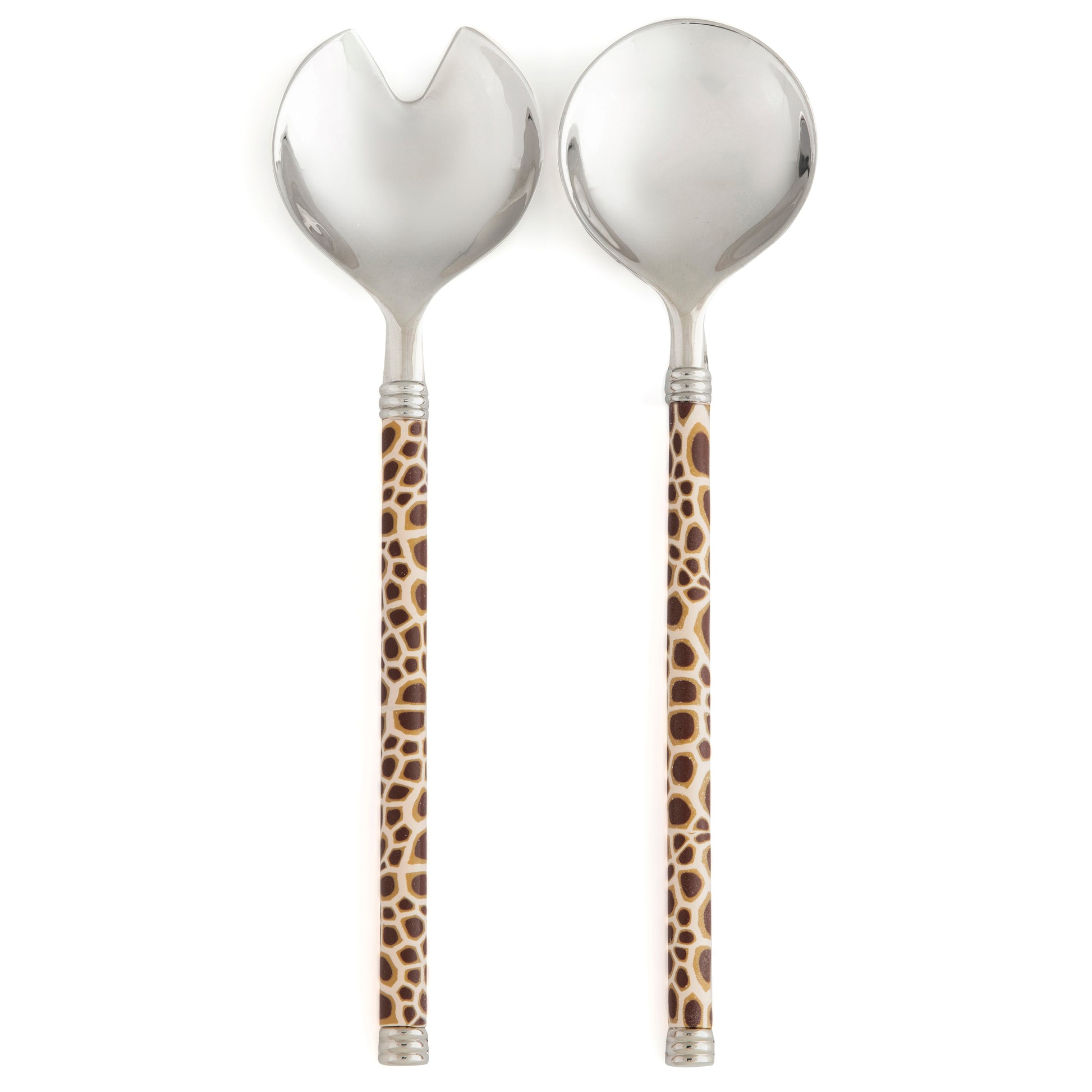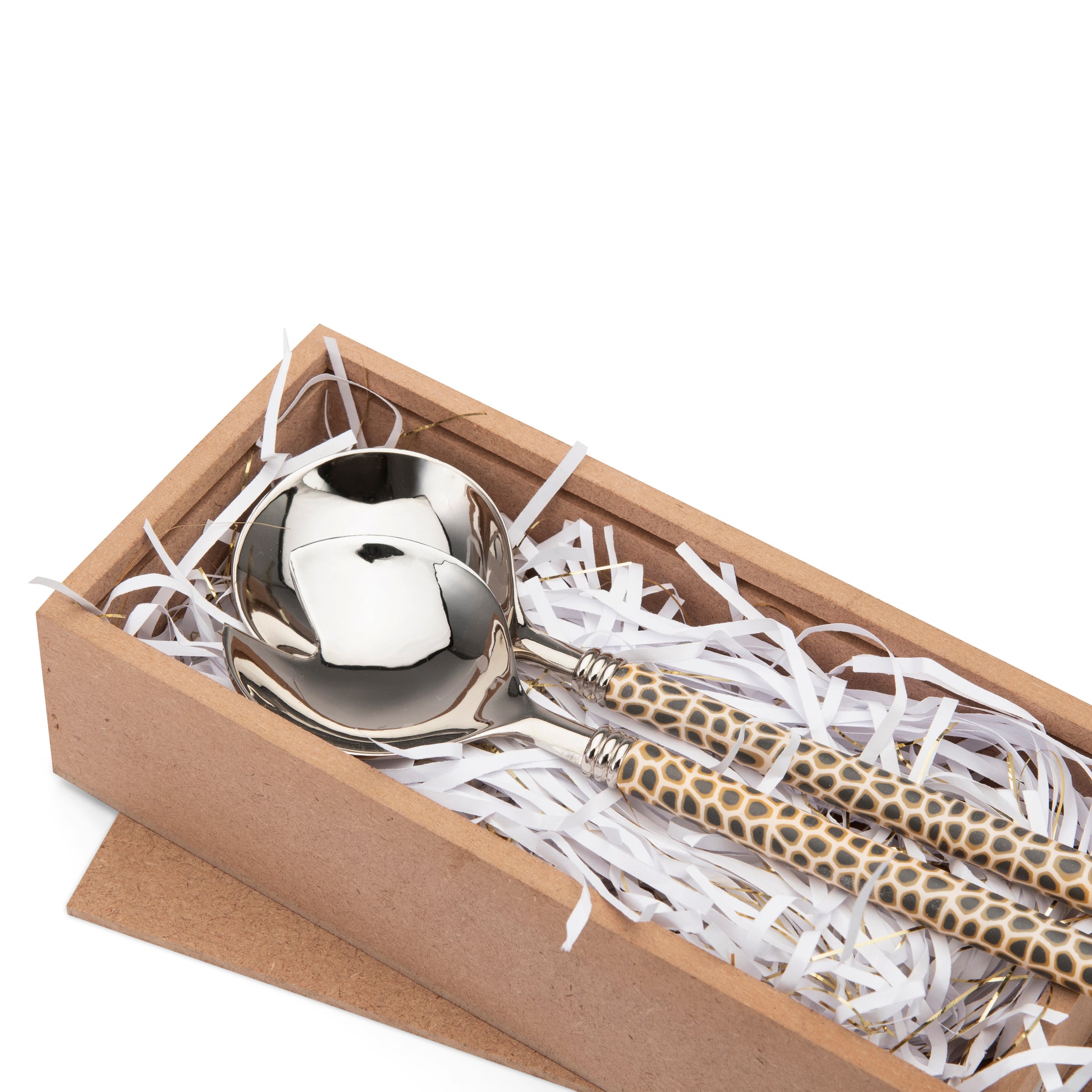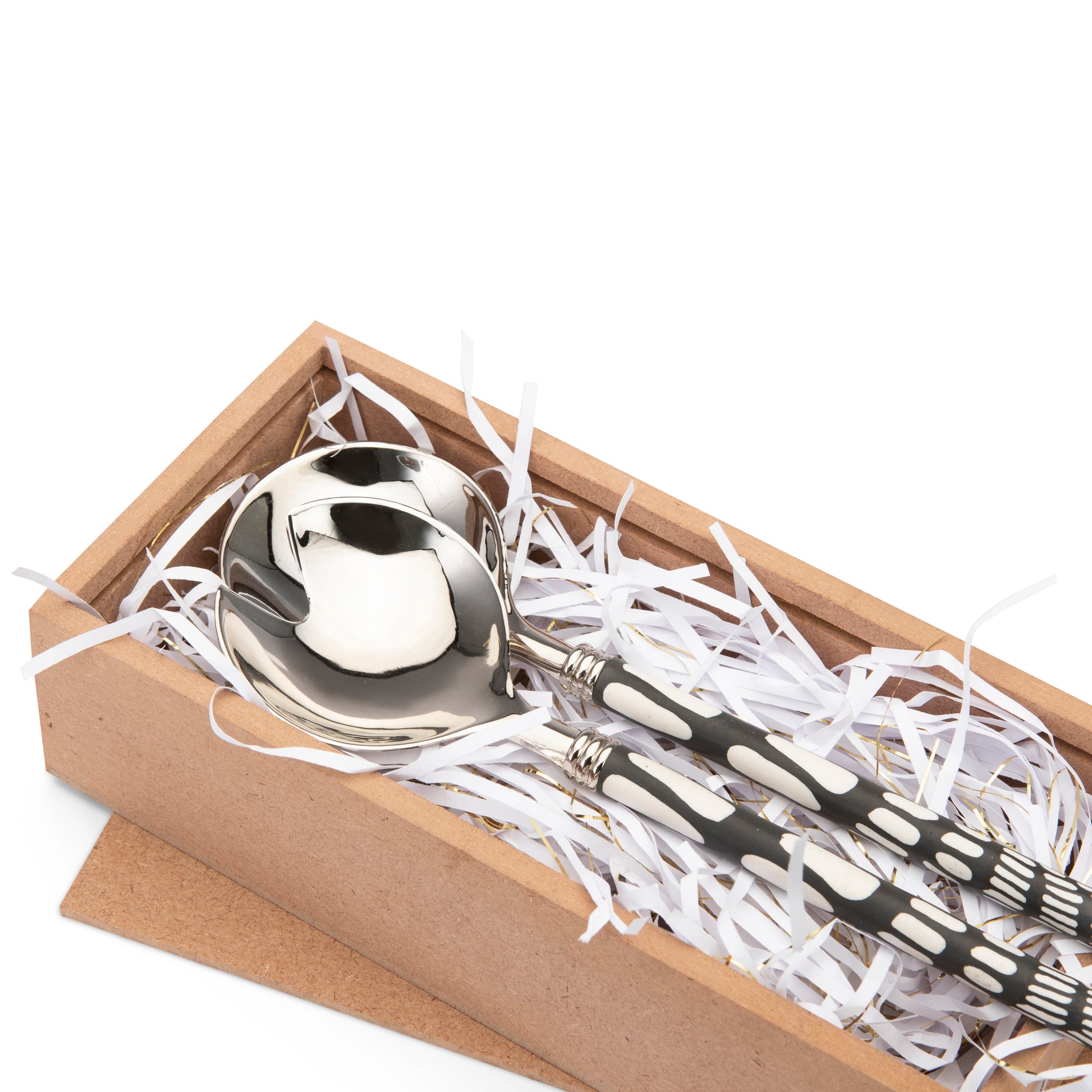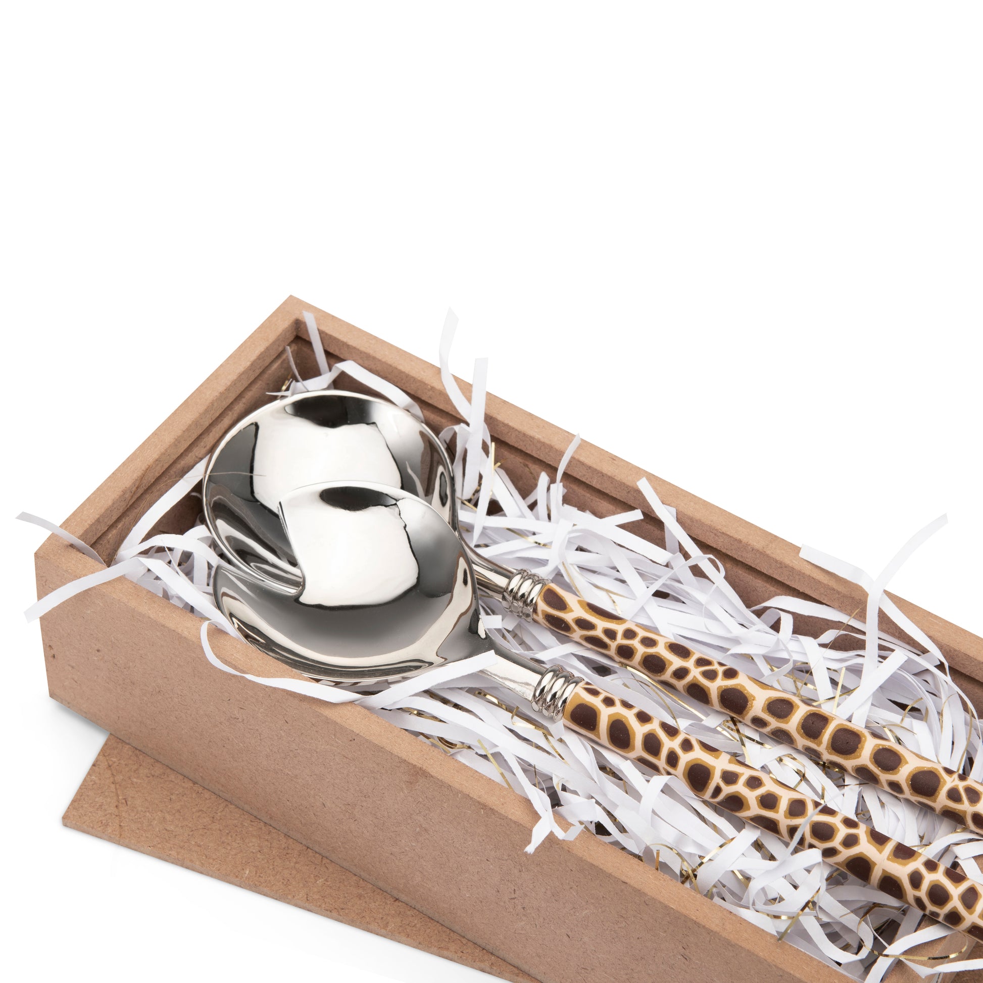 Salad server set: Dish-up in style with these animal print, fimo salad servers. Their wide faces, long stems, silver-plated and fimo materials makes them both durable and functional. Perfect for any occasion, you will want to show off these African designed keepsakes to all who take a seat at your table. Receive your serving spoons in style – beautifully packaged in a wooden gift box and cushioned with confetti.