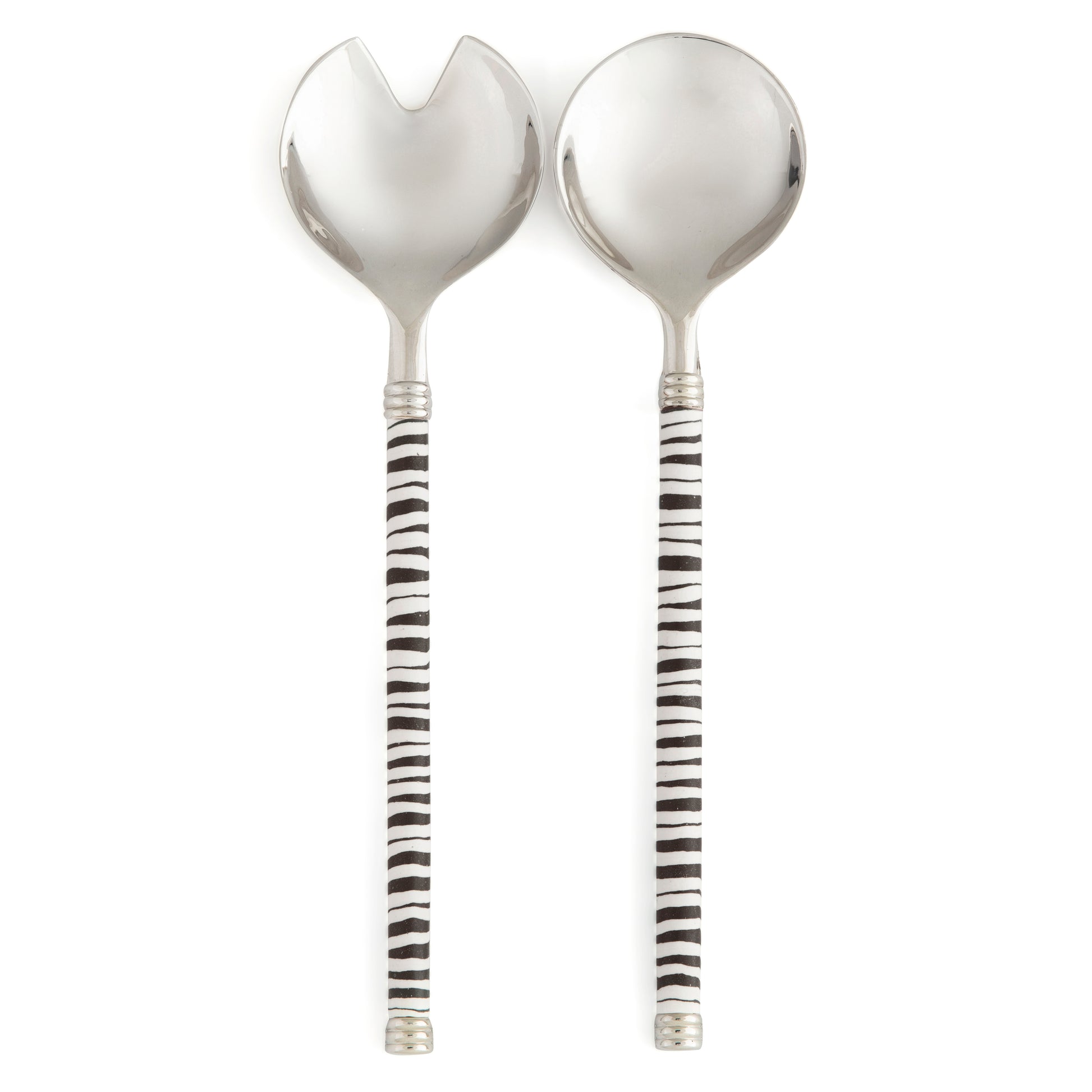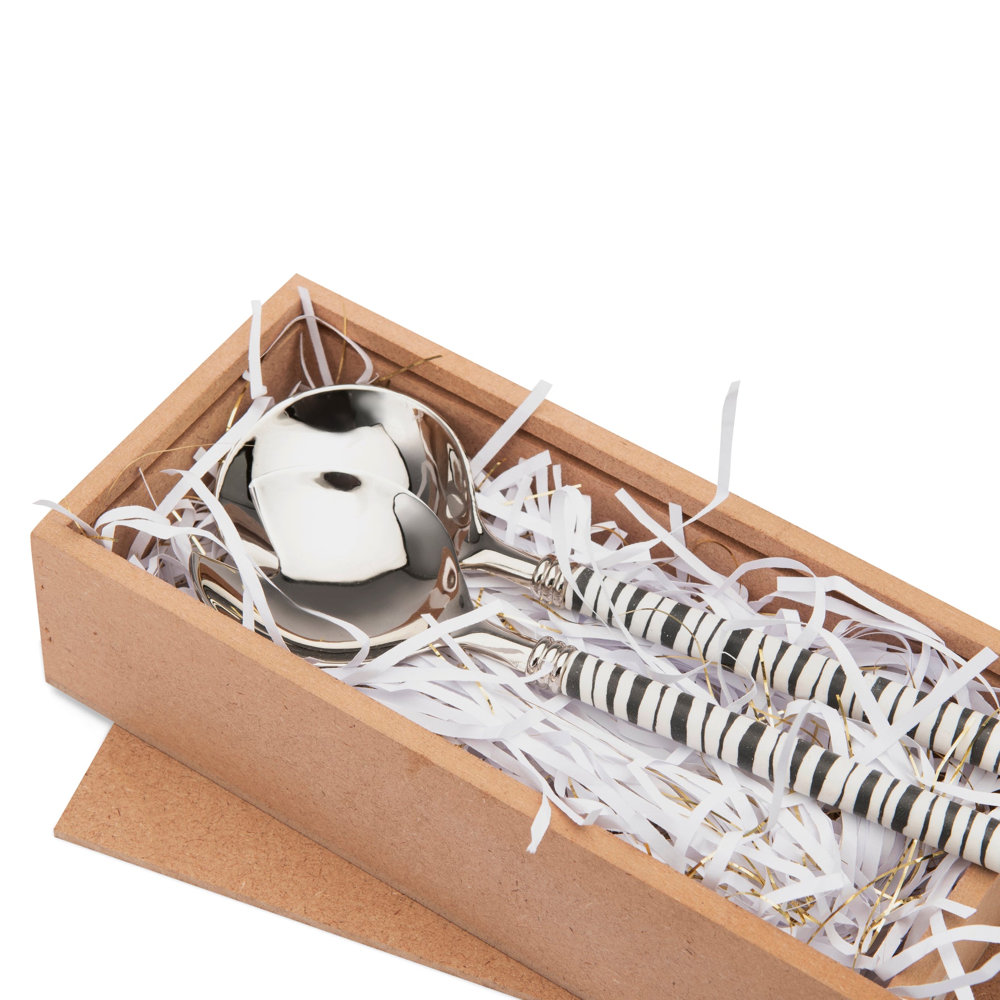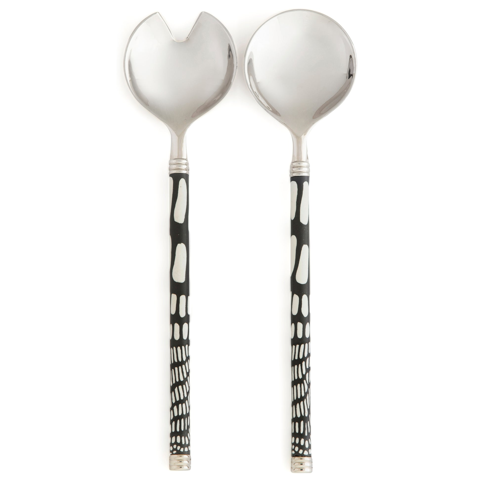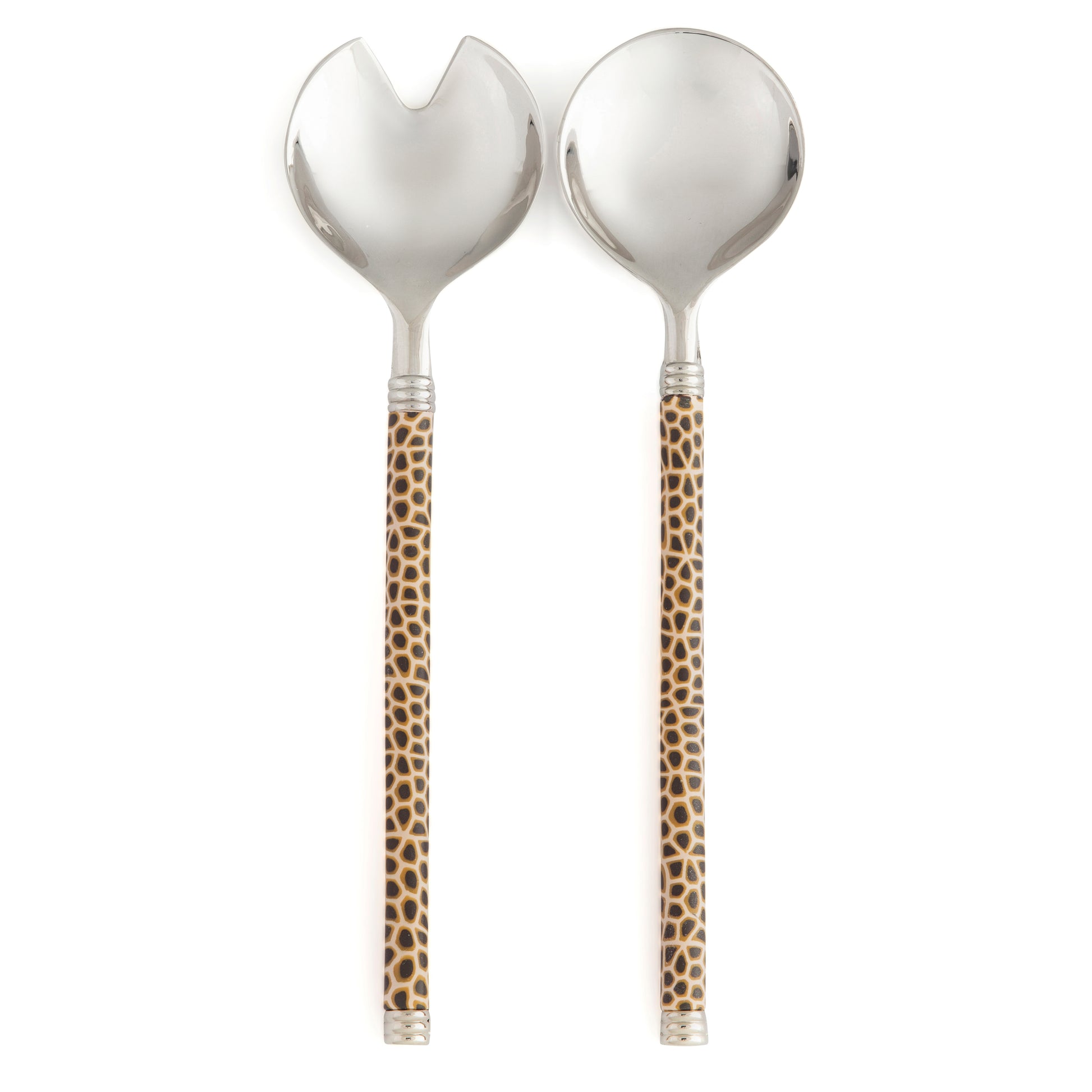 Salad server set: Dish-up in style with these animal print, fimo salad servers. Their wide faces, long stems, silver-plated and fimo materials makes them both durable and functional. Perfect for any occasion, you will want to show off these African designed keepsakes to all who take a seat at your table. Receive your serving spoons in style – beautifully packaged in a wooden gift box and cushioned with confetti.