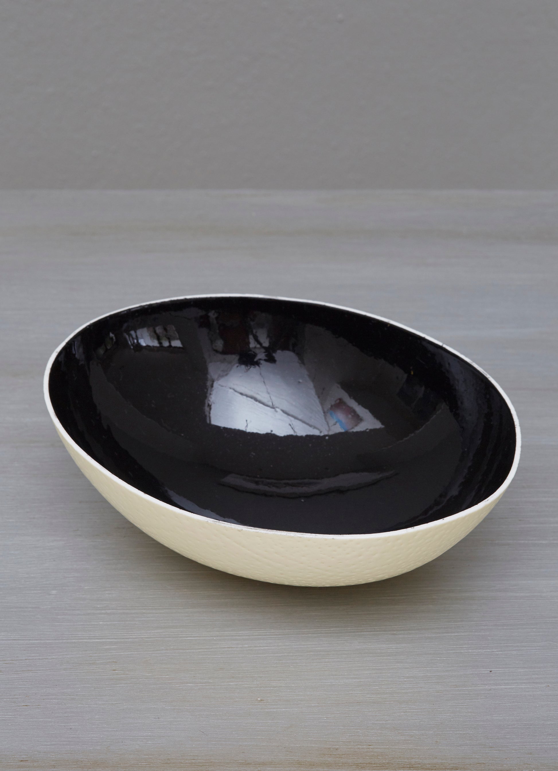 This striking ostrich eggshell bowl would not be out of place in an art gallery, yet its functionality makes it the perfect centrepiece for an entrance stand or side table. The soft hues of the outer shell are contrasted with a gleaming black glaze on the inside. A coiled base provides stability.
