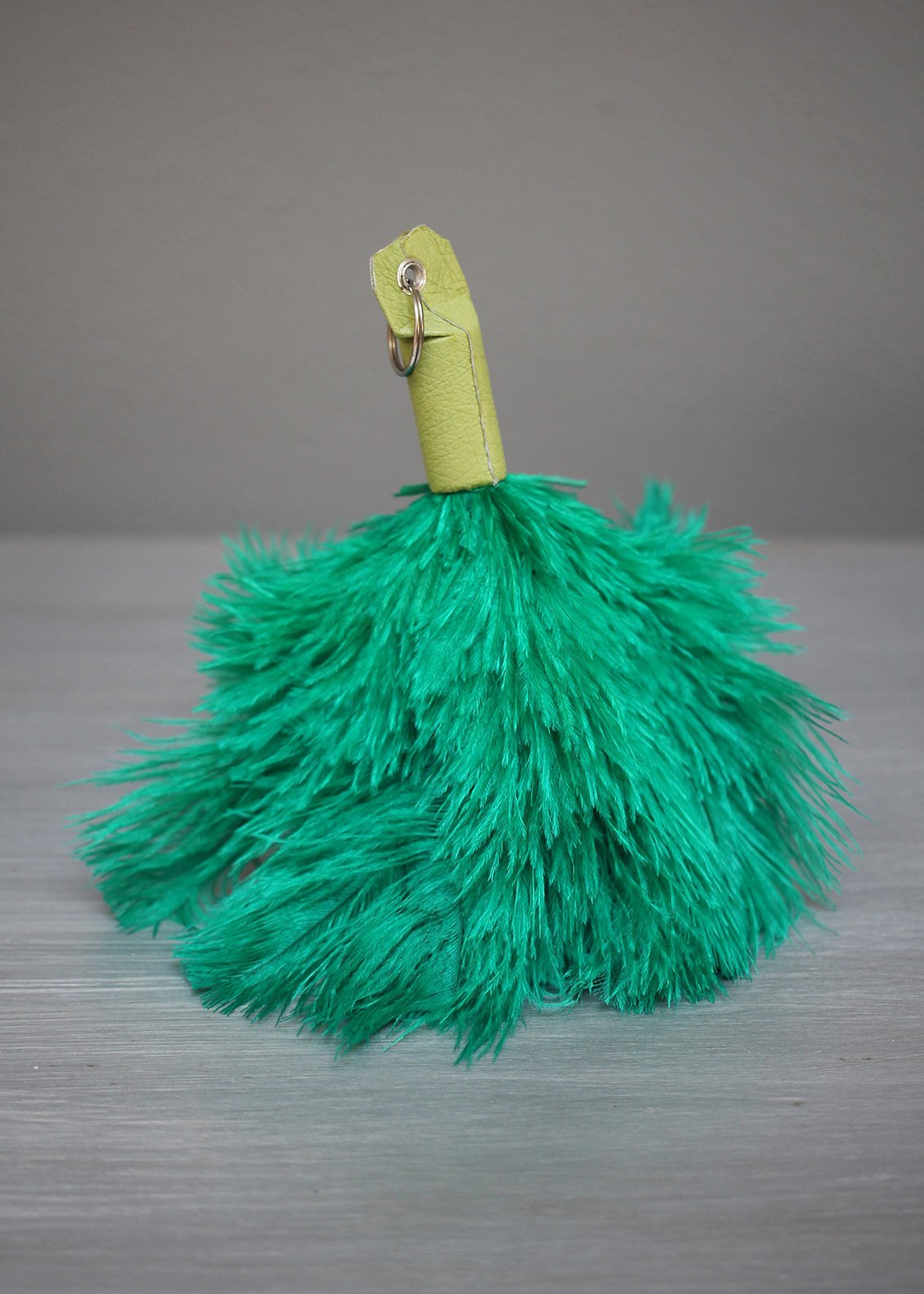 A fashion statement on its own, this vivid green ostrich feather keyring is simply fabulous. The brightly dyed ostrich feathers are gathered into a sturdy leather base complete with silver keyring. Multi-functional the keyring feathers can also be used as a mini feather duster for your computer keyboard. You will be the talk of the town with this unique piece.