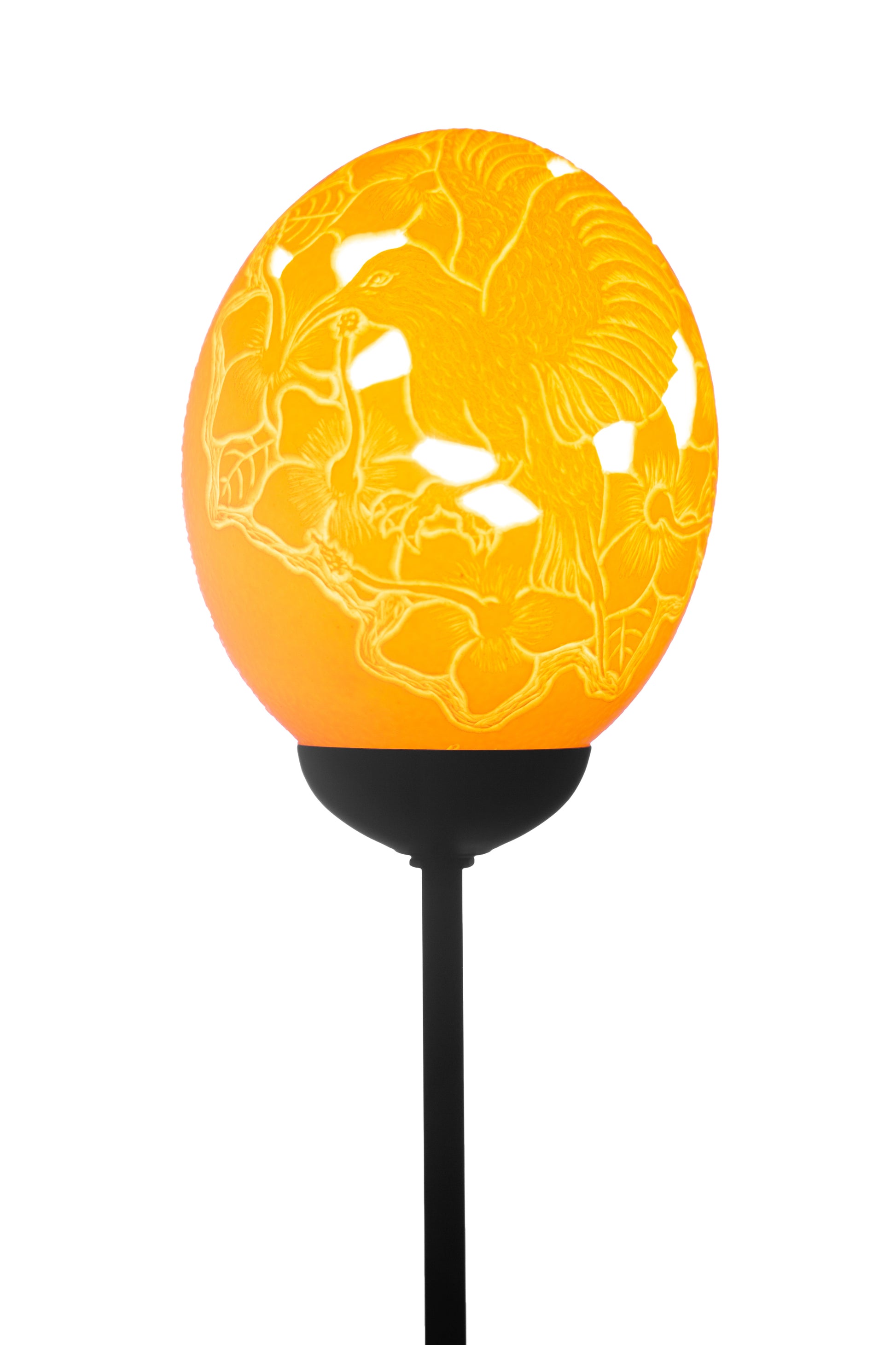 Providing a warm glow through the delicate carving of an African hummingbird in an ostrich eggshell, this delightful freestanding lamp will complement any part of the house or make for a stylish gift. On the front, the hummingbird is surrounded by flowers while on the back, the African continent has been carefully shaped. The ostrich egg is placed on a slender metal stand. Certificates of authenticity supplied on request.