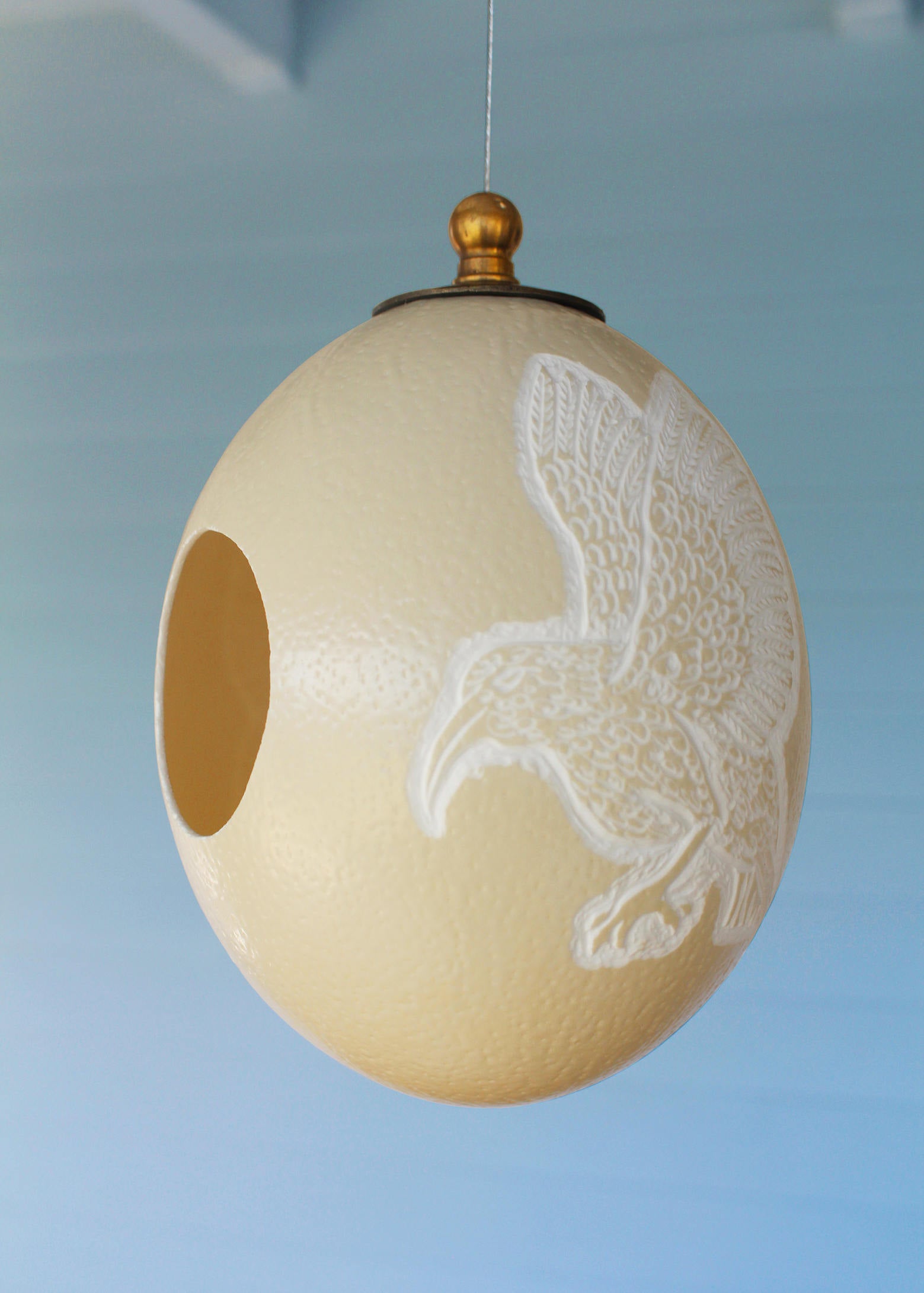 Birds love eggs and so will you. Handcrafted ostrich eggshell Egg Bird Feeders attract many types of wild birds and is perfect for the extremes of outdoor weather. The elegant design with a beautifully etched hummingbird is a perfect addition to any outdoor environment. The handmade Egg Bird Feeder is also easy to use, durable and squirrel proof. There are two holes and birds eat from the base until the egg is empty.