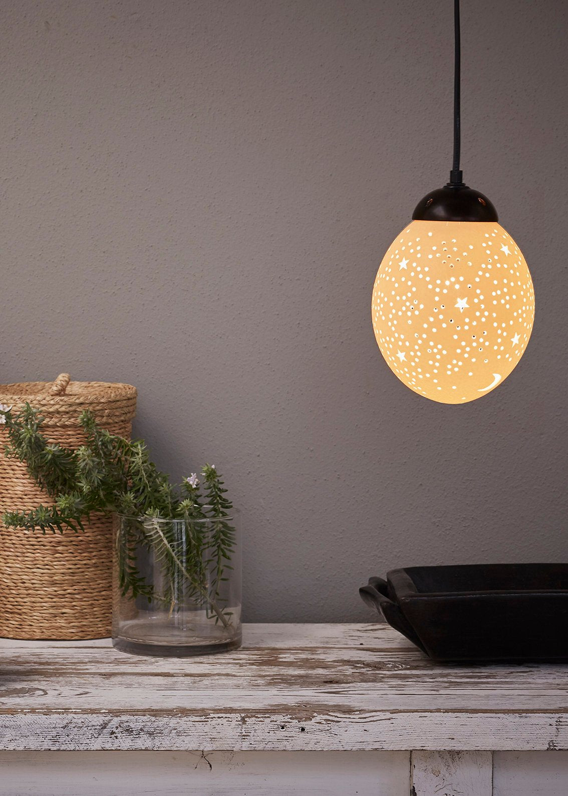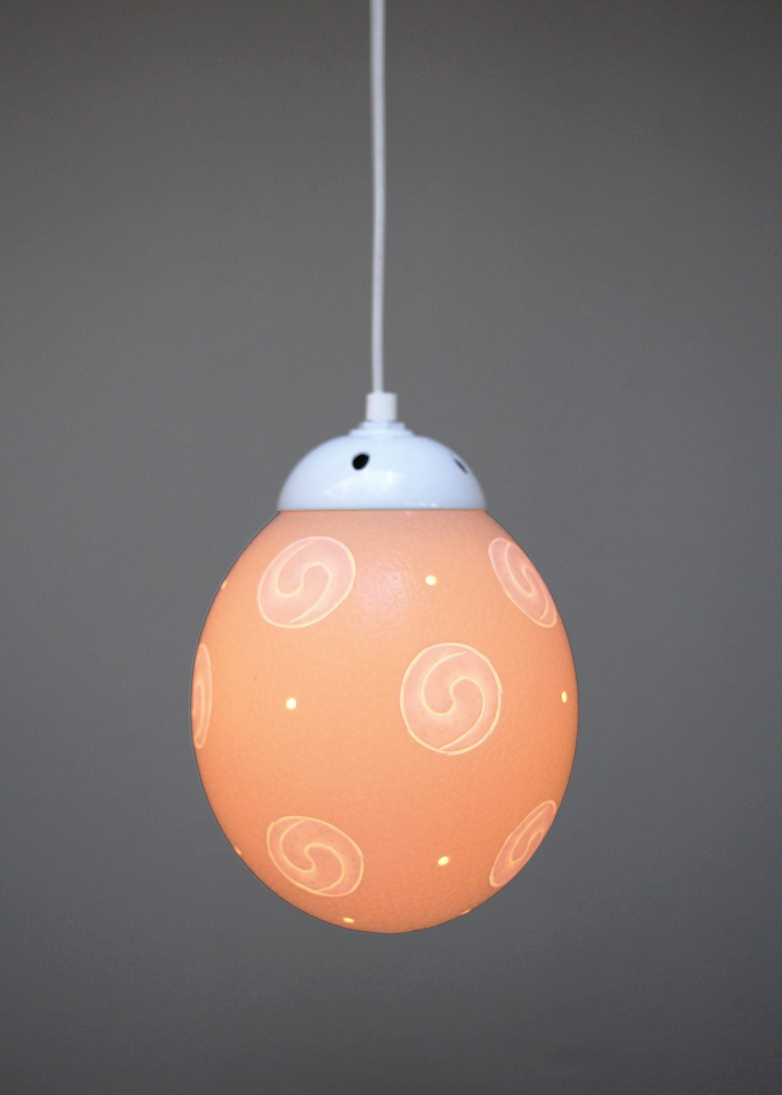 Stylish twirls carved into the timeless shape of an African ostrich eggshell provide a soothing ambient light from these creative and unique pendants. Each ostrich egg is painstakingly cleaned and carved by South African artisans to provide a quality and unforgettable lighting experience. The eggs are attached to an elegant white or black metal base and cord that complements the opulence of the glowing egg.