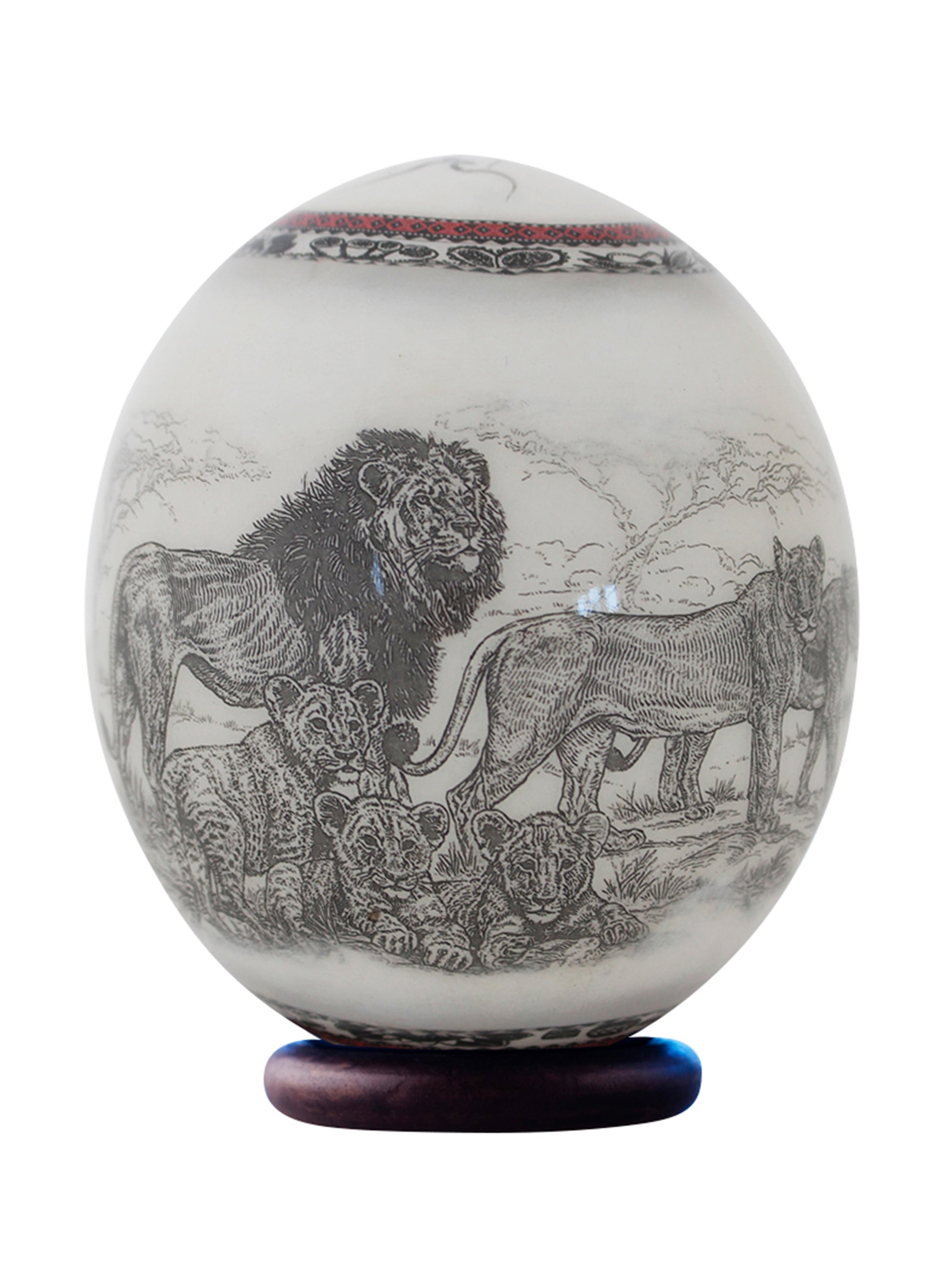Fearsome lions ā the undisputed king of the African landscape ā take pride of place on this beautifully depicted and decoupaged ostrich eggshell. Set in the African bushveld, a pride of lions sit under an indigenous tree in the otherwise desolate landscape. The image is evocative in contrasting white, black and red.