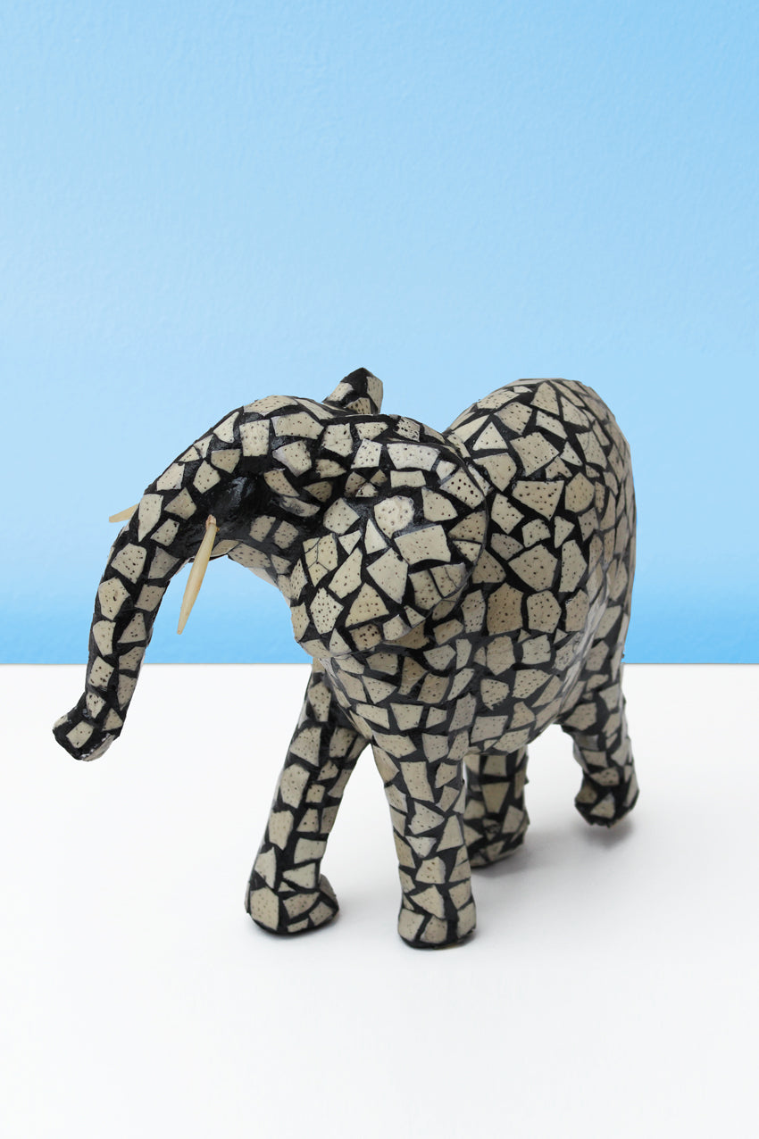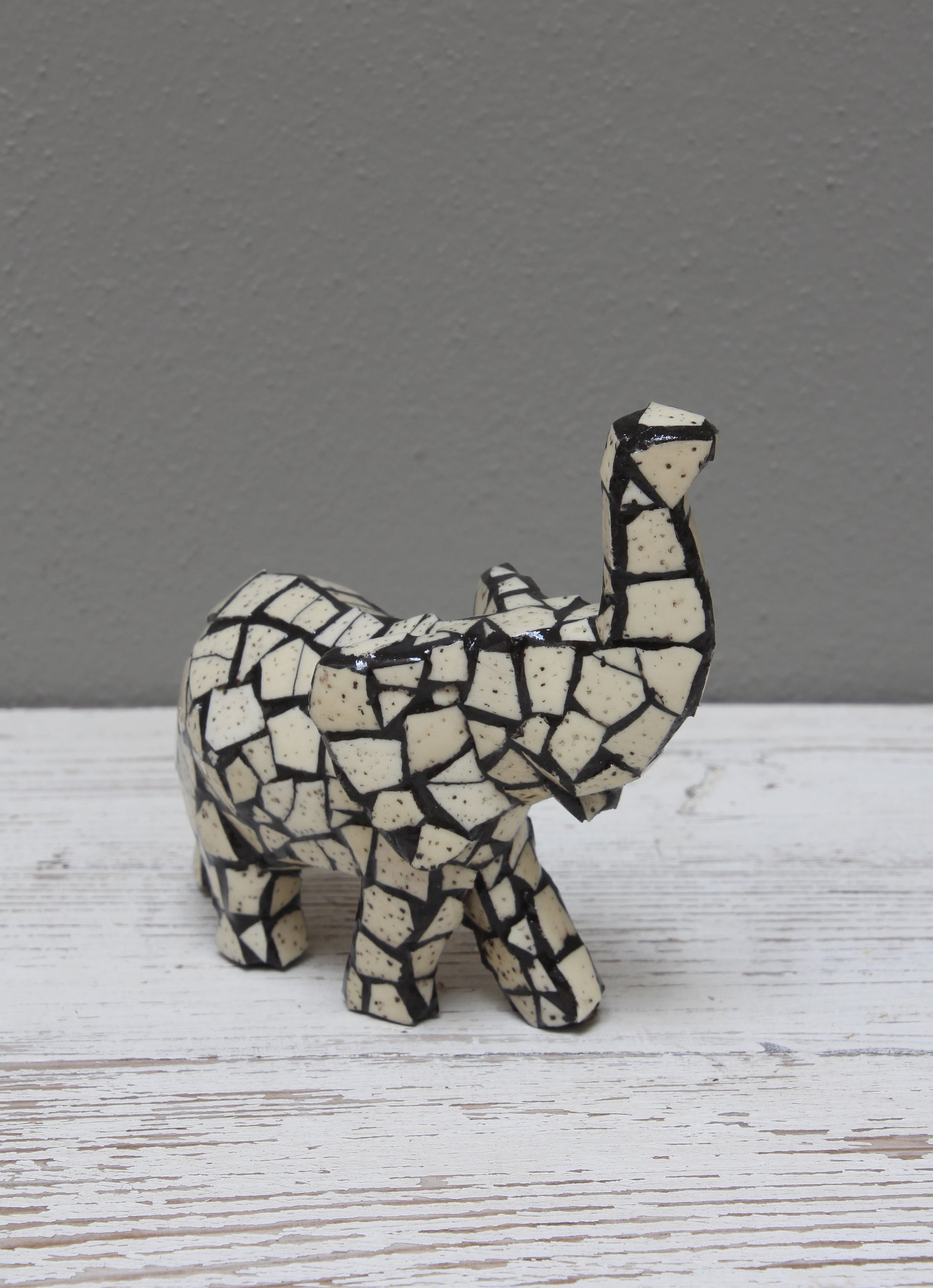 An evocative rendering of the majestic African elephant. The ostrich eggshell elephant will appeal to all ages with its classic stance and mosaic exterior with carefully cut and placed ostrich eggshells. A sure-fire winner as a gift, although you might not want to give it away.