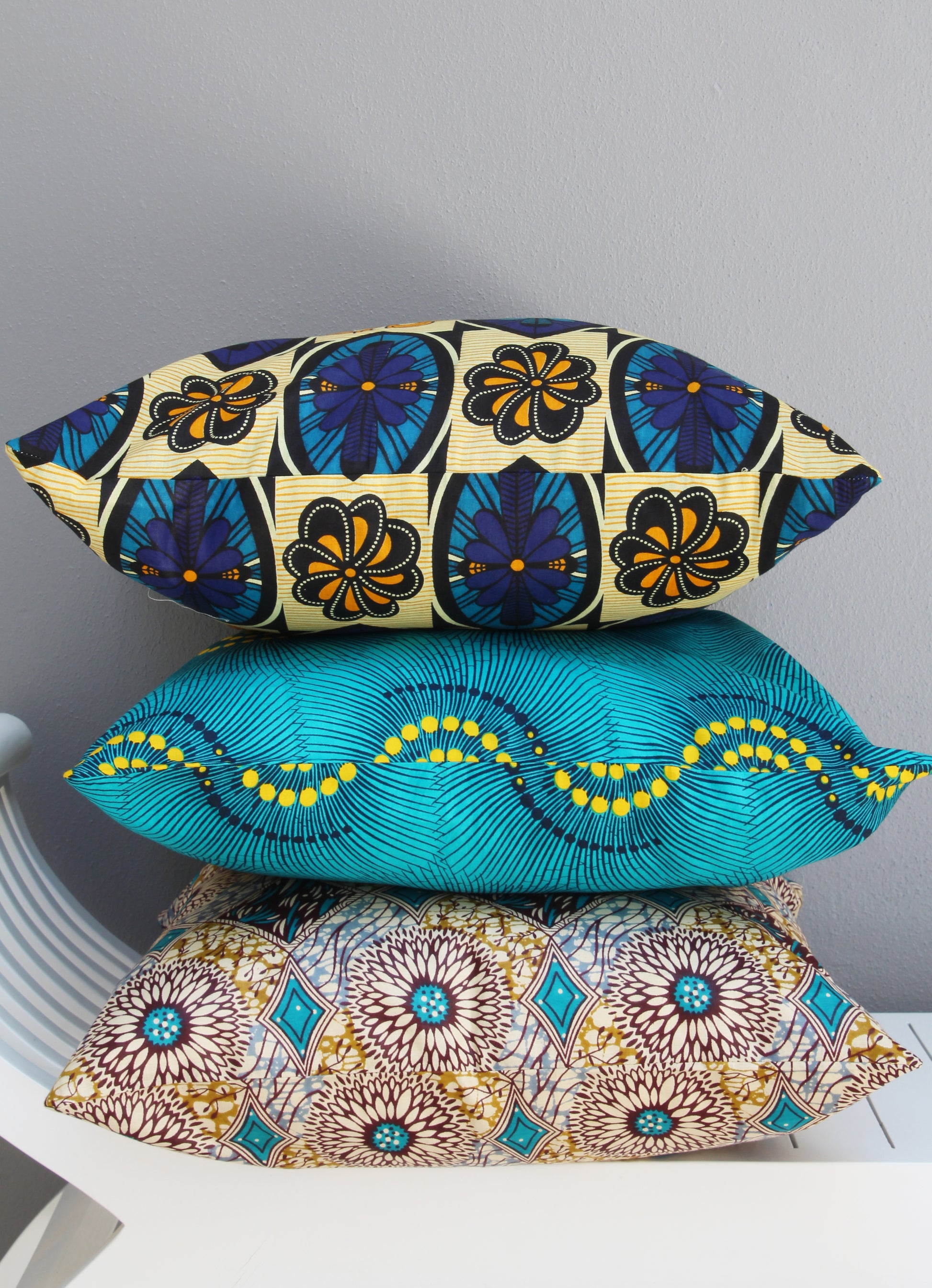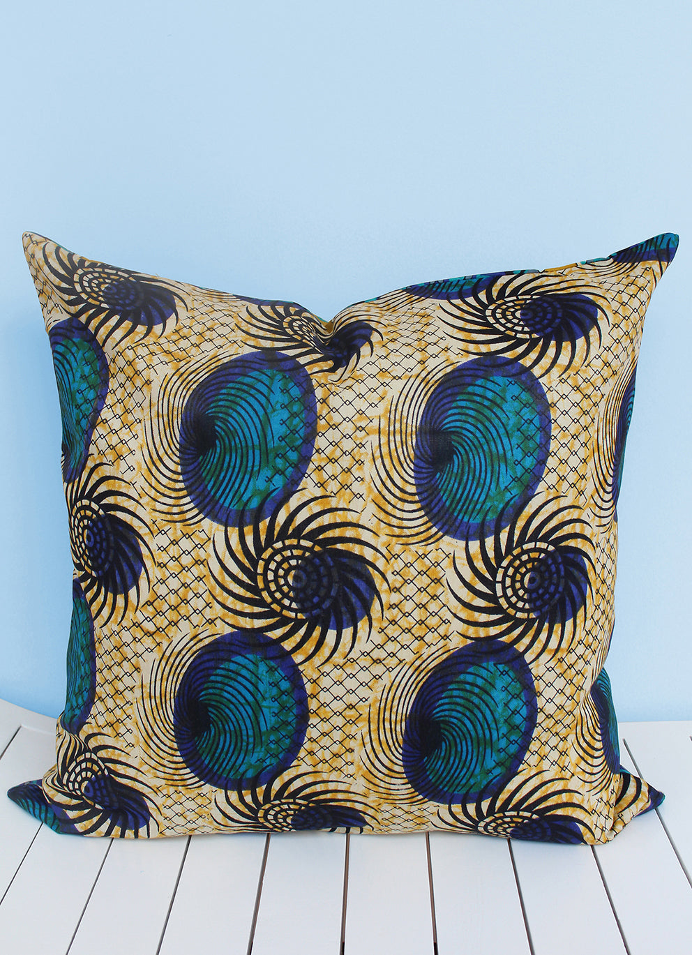 Contrasting turquoise, brown and yellow Shweshwe and Java wax African print scatter cushions 50 x 50cm: Illuminate your home with these eyecatching mixed print African cushions. Shweshwe is printed dyed cotton, traditionally used for traditional South African clothing. A perfect gift and a striking piece to any entrance hall or lounge.