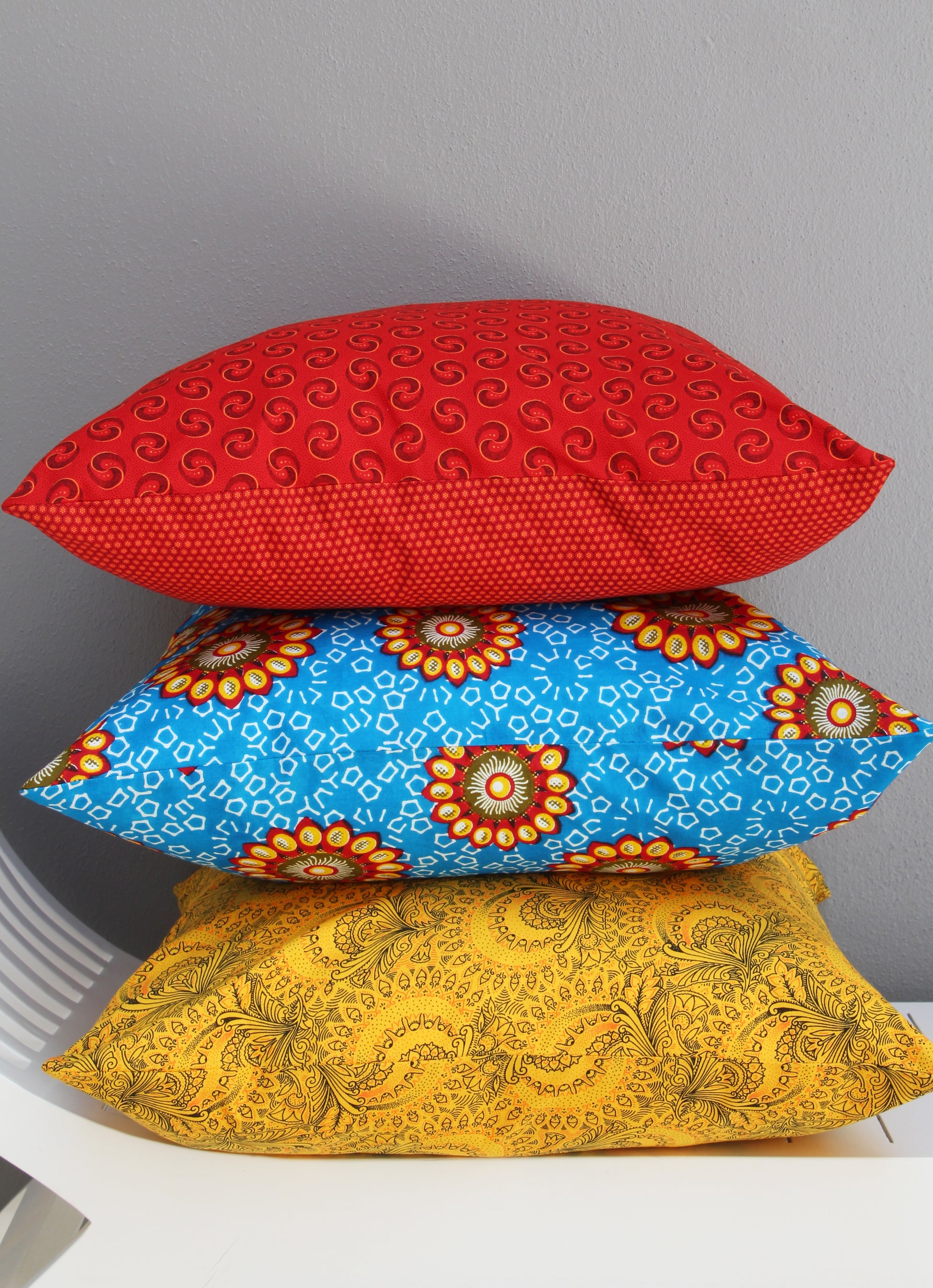 Contrasting turquoise, red and yellow Shweshwe and Java wax African print scatter cushions 50 x 50cm: Illuminate your home with these eyecatching mixed print African cushions. Shweshwe is printed dyed cotton, traditionally used for traditional South African clothing. A perfect gift and a striking piece to any entrance hall or lounge.