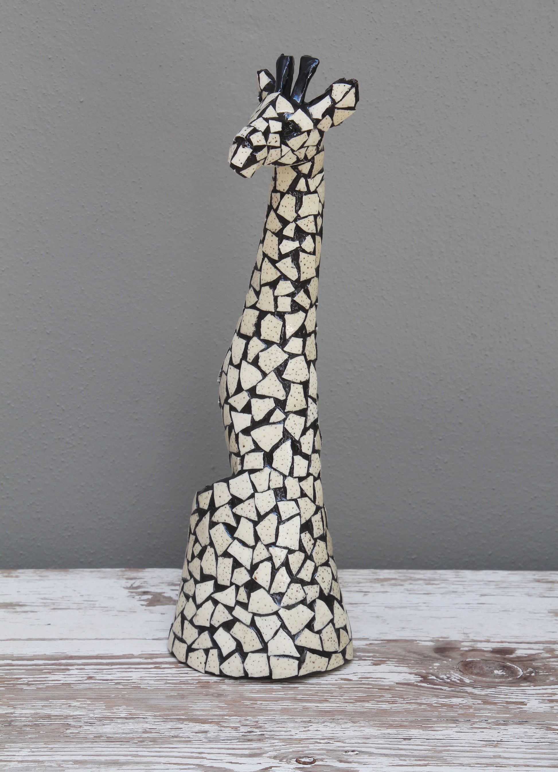 The enigmatic and totally African giraffe twists his head to gaze into the distance. Captured in a mosaic of carefully cut and placed ostrich eggshells, this piece is an evocative reminder of the African wild. While perfect for that cupboard of mementoes, this piece will finds its way to pride of place on a mantelpiece, bedside table or office desk.
