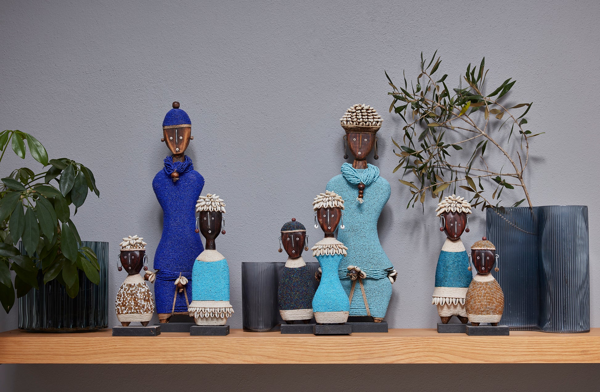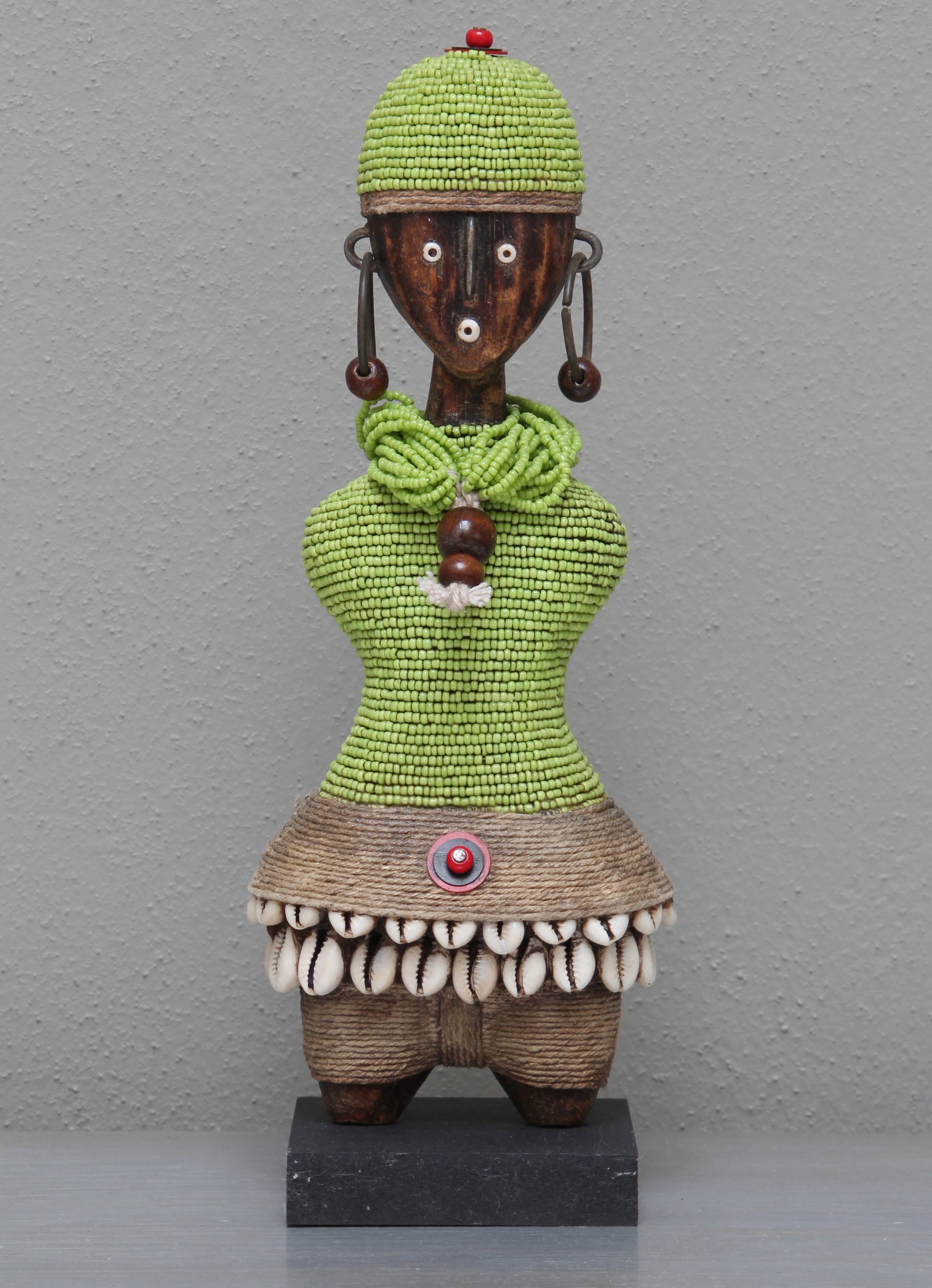 Striking and charismatic, the male Namji fertility doll is for those who favour the unusual. This beautifully crafted wooden doll is set on a wooden base and clothed in greenĀ beads embellished with cowry shells. The traditional head covering of green beadsĀ knitted together makes a striking visual image and a sure talking point regardless of your gender.