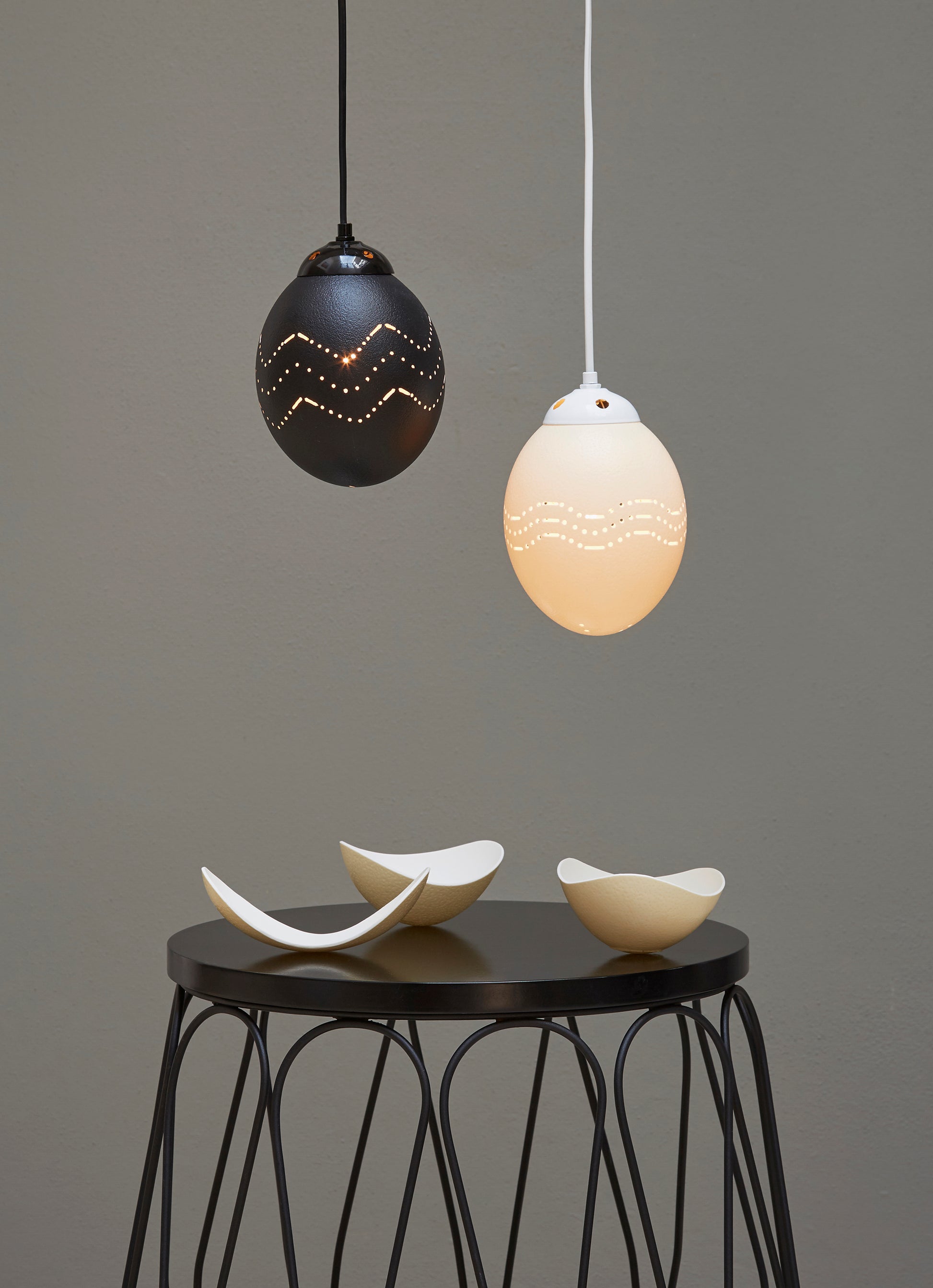 Our super sexy ostrich eggshell pendant lights ooze class and sophistication. Buy one or group them for maximum effect. Their simple design with geometric cut-out patterns makes a statement on its own. The soothing design and warm glow provided by the pendant will enhance the ambience of any room in the house. The egg is attached to an elegant white or black metal base and cord that complements the opulence of the glowing egg.