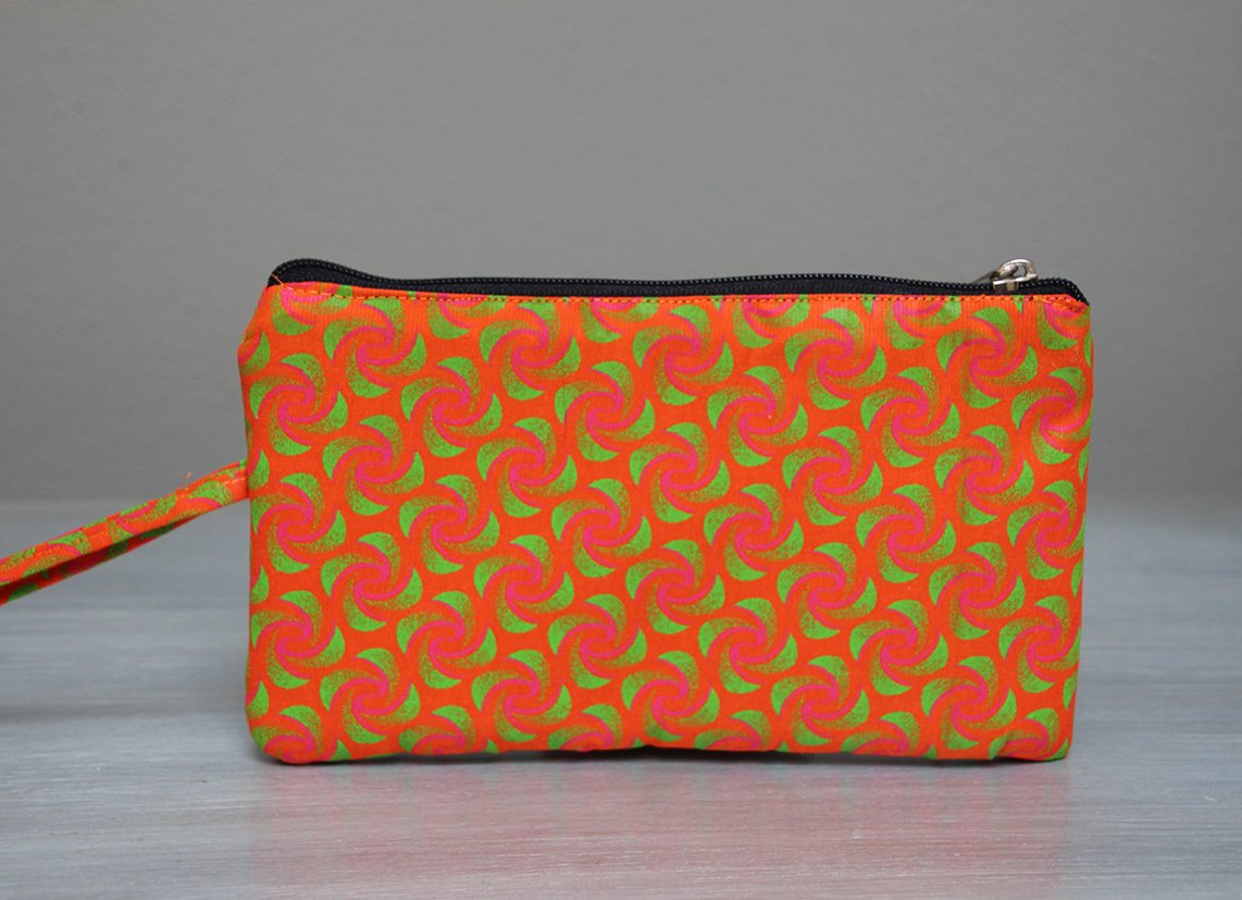 This gorgeous African Shwe-shwe purse, orange and green with hints of pink detail is designed, printed and handmade locally in South Africa. It is approximately 22cm W x 13cm H and closes with a zip.