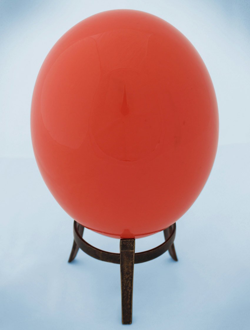 Orange, the colour of passion, permeates the oval shape of the African ostrich eggshell in a deep glaze. Sultry and modern, this piece would suit a stylish home and those discerning collectors looking for decor that is simply out of the ordinary. The combination of texture and rich orange glaze ensures that this piece will stay the centre of attention for a long time. Placing beautifully coloured ostrich eggs inside a bowl or on a brass stand provides that perfect contrasting décor piece.