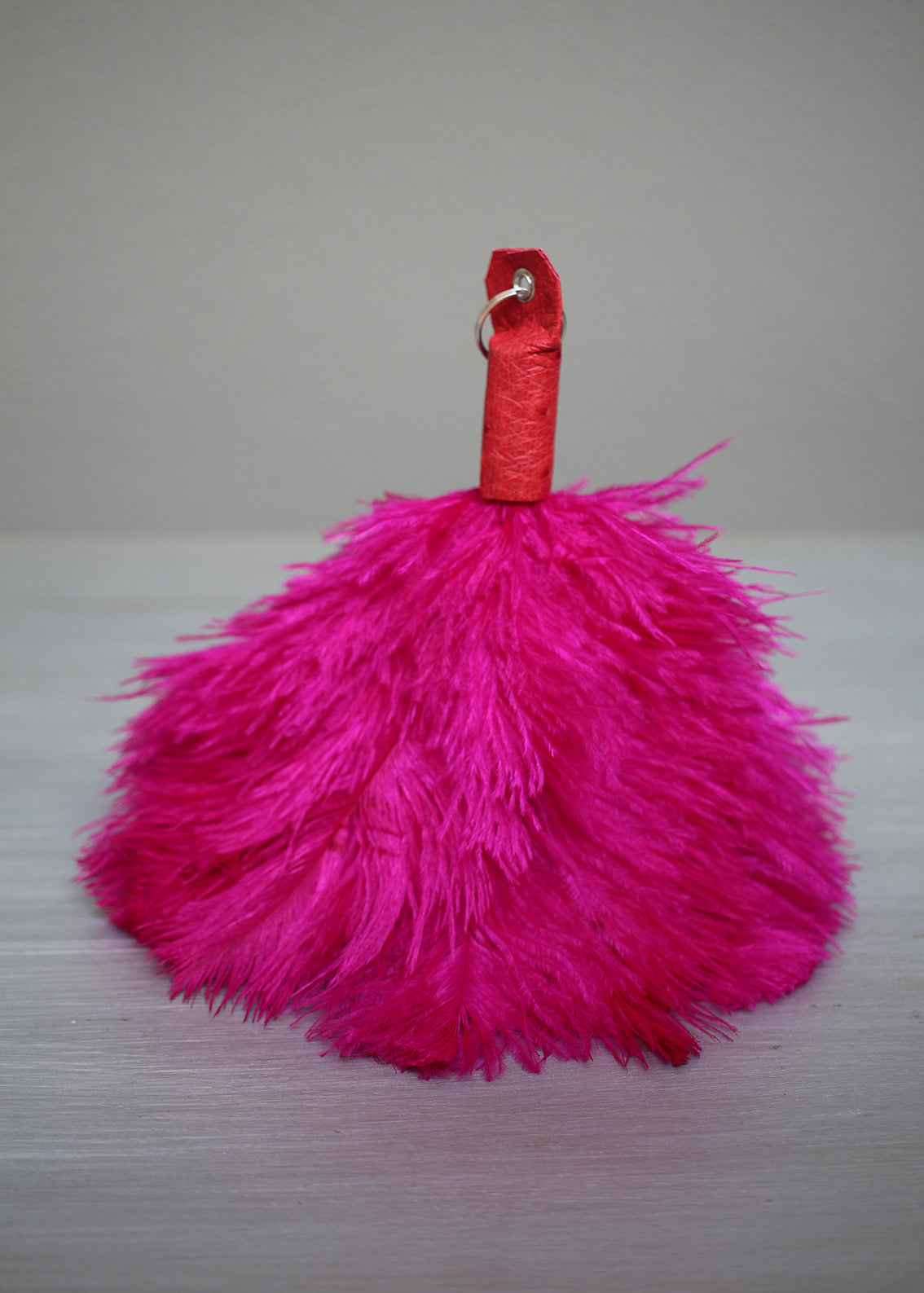 A fashion statement on its own, this vivid pink ostrich feather keyring is simply fabulous. The brightly dyed ostrich feathers are gathered into a sturdy leather base complete with silver keyring. Multi-functional the keyring feathers can also be used as a mini feather duster for your computer keyboard. You will be the talk of the town with this unique piece.
