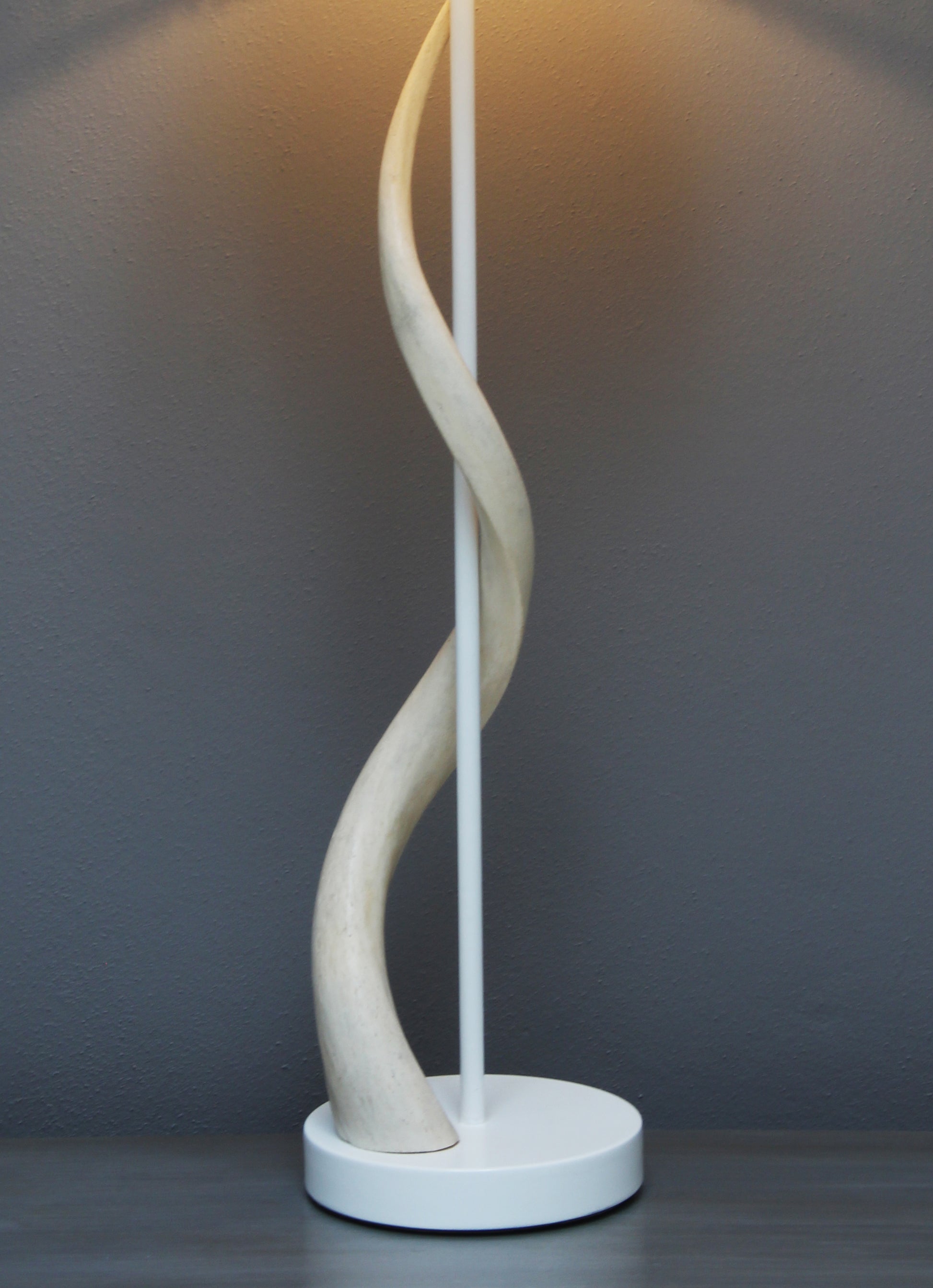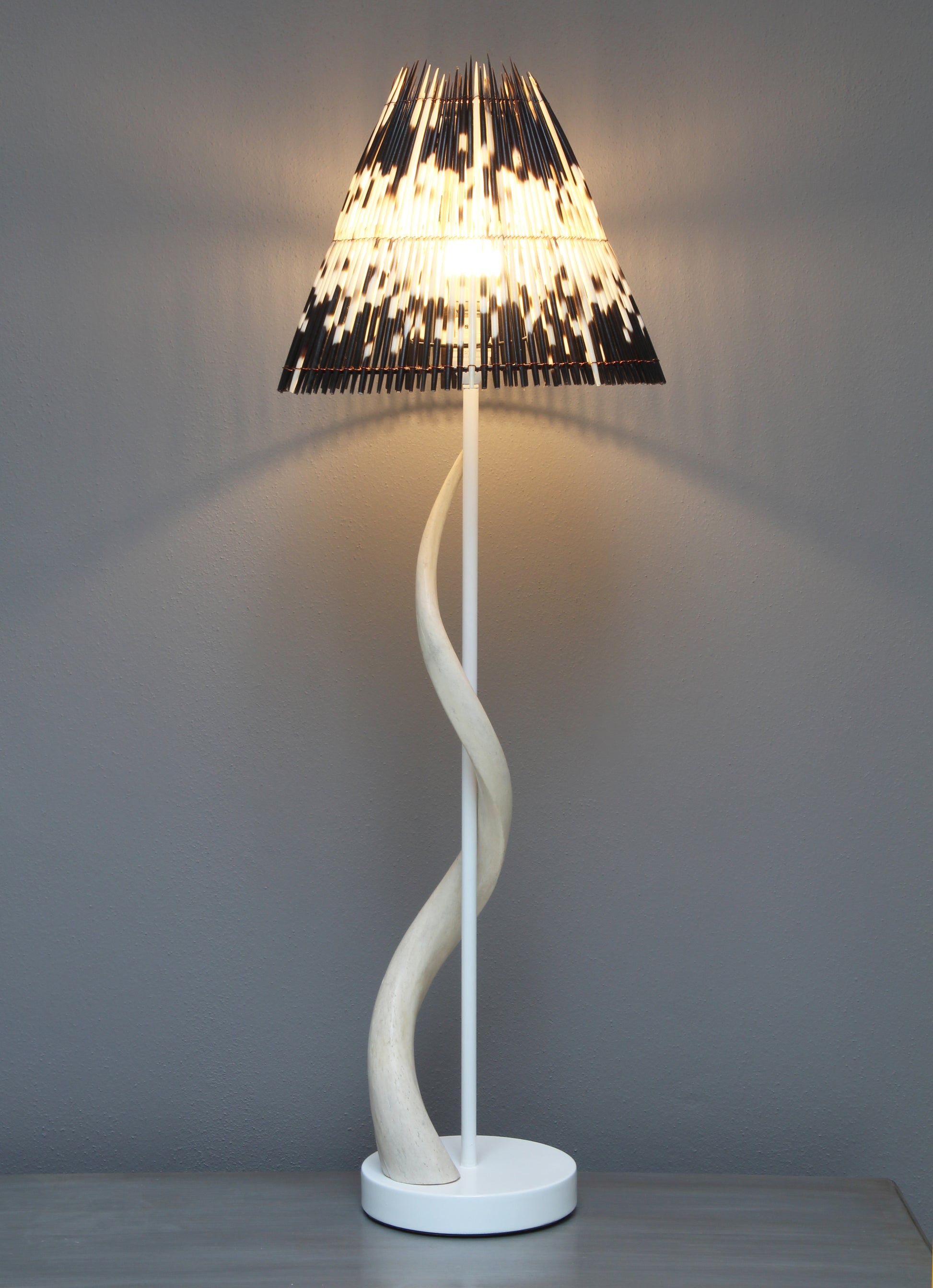 Illuminate the beauty of any room with the natural effect of this African wildlife inspired lamp. Rising from the base, the spiraling effect of the kudu horn reaches a zenith at the lamp light which shines through a coned lampshade made up of a sheath of porcupine quills, each unique and diverse in pattern and design, for a wraparound effect that elegantly manipulates the thrown light. Place it as a centerpiece in a reception room or use a matching pair on the nightstands of a bedroom boudoir fit for a king and queen.