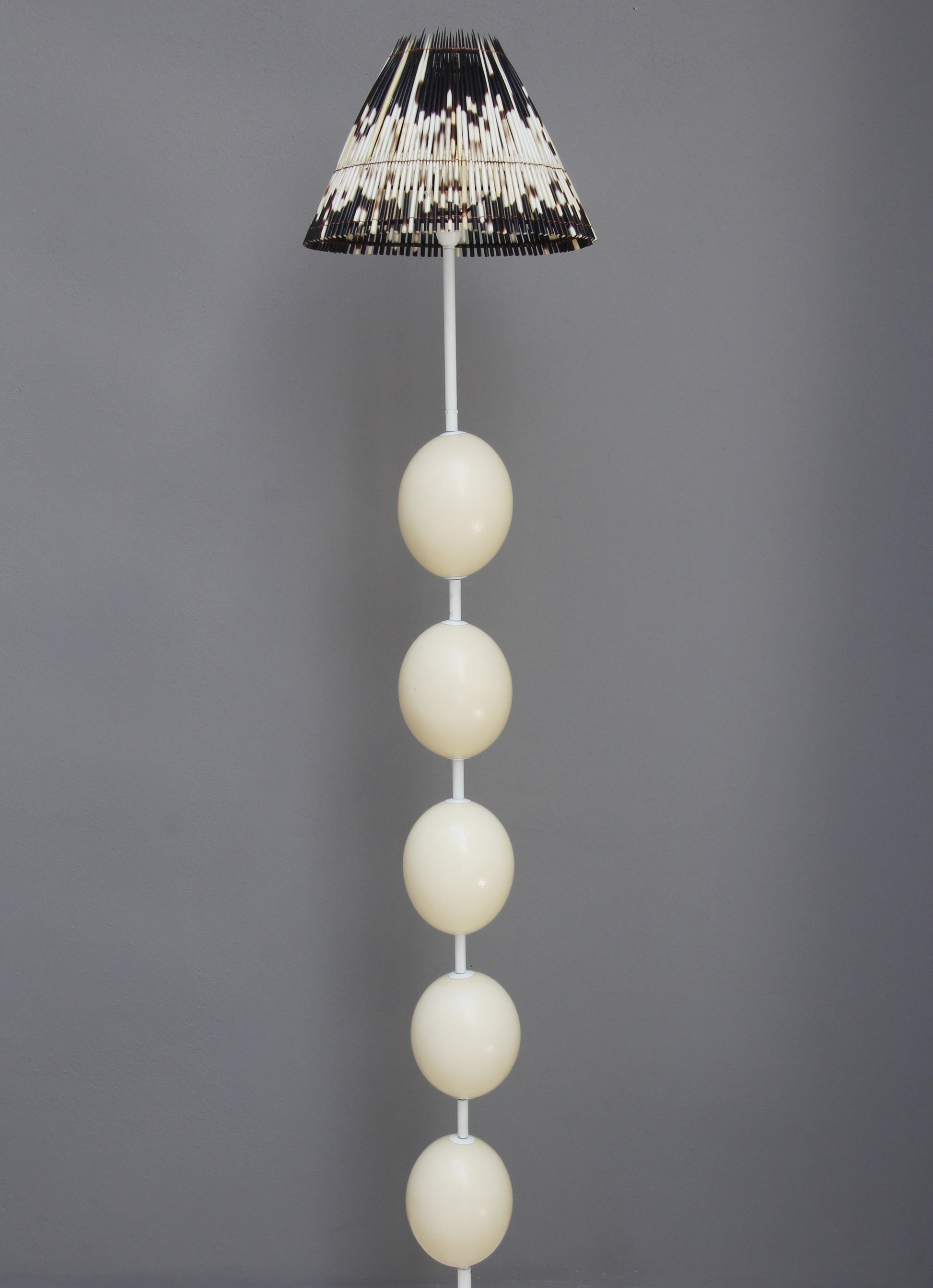 Illuminate the beauty of any room with the natural effect of this African wildlife inspired lamp. Rising from the base, the spiraling effect of multiple ostrich eggs reaches a zenith at the lamp light which shines through a coned lampshade made up of a sheath of porcupine quills, each unique and diverse in pattern and design, for a wraparound effect that elegantly manipulates the thrown light. Place it as a centerpiece in a reception room / office or lounge fit for a king and queen.