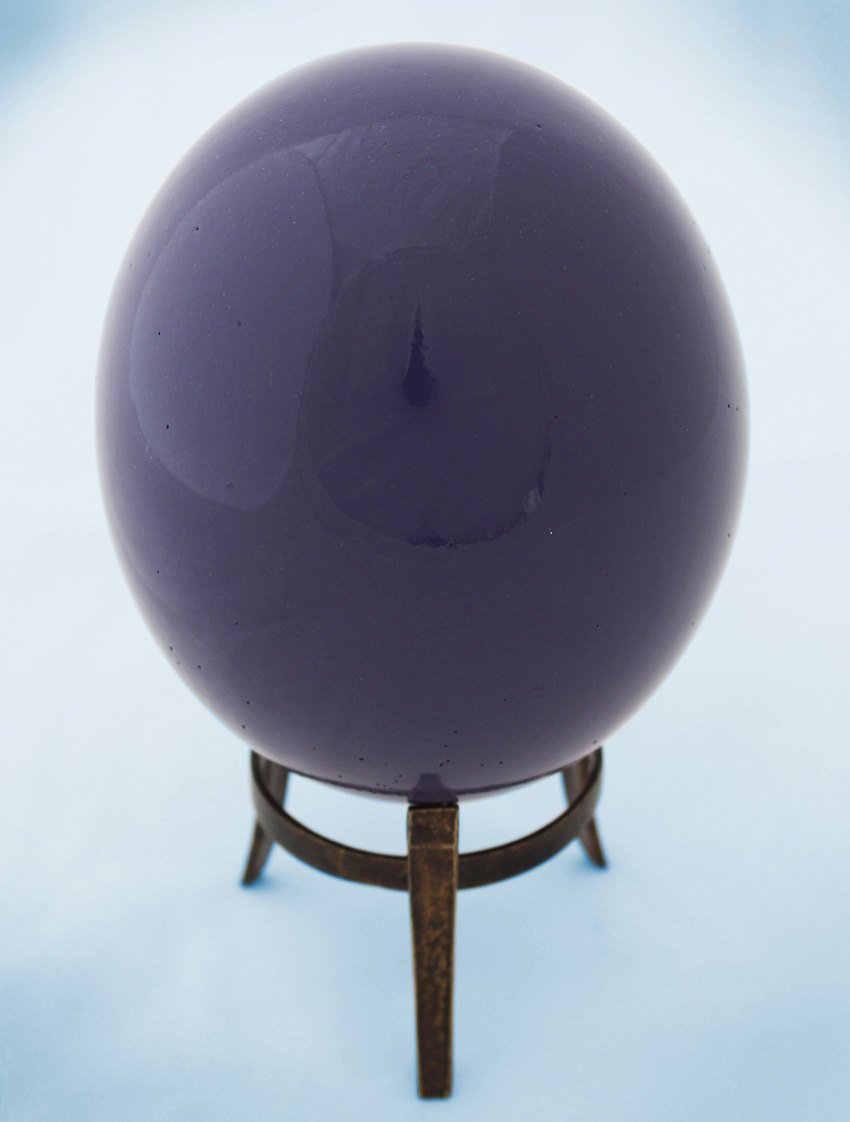 The soothing shape of the African ostrich egg is complemented by the deep purple hue of the glaze. The result is a spectacular statement piece that would appeal to discerning men looking for that something out of the ordinary for their home or office. The egg can be placed on an elegant brass stand or assembled in a bowl. These funky pieces speak to Africa, yet firmly look ahead to modern city life.
