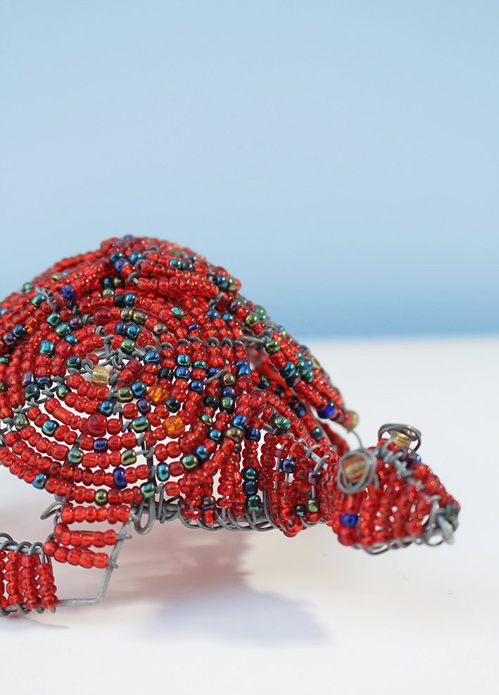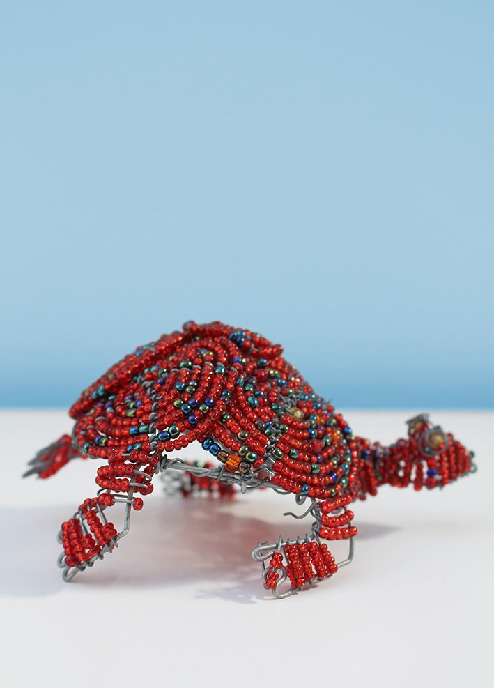 The characterful African tortoise is vividly captured in this wire-framed and predominantly red beaded frame. The grace of this slow-moving creature and beauty reflects with glossy highlights of blue, metal grey and green. Approximately 13cm long and 10cm wide but can be custom made to any size.